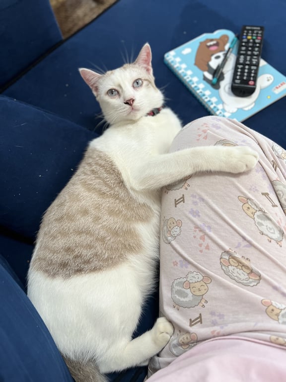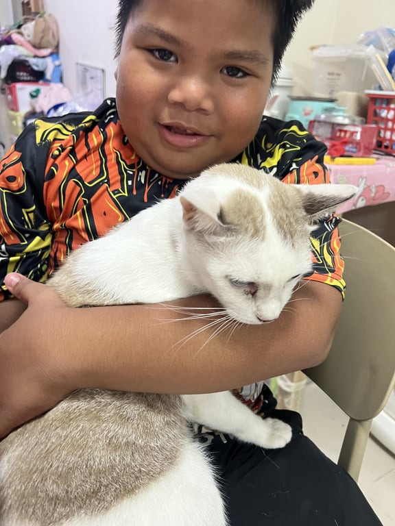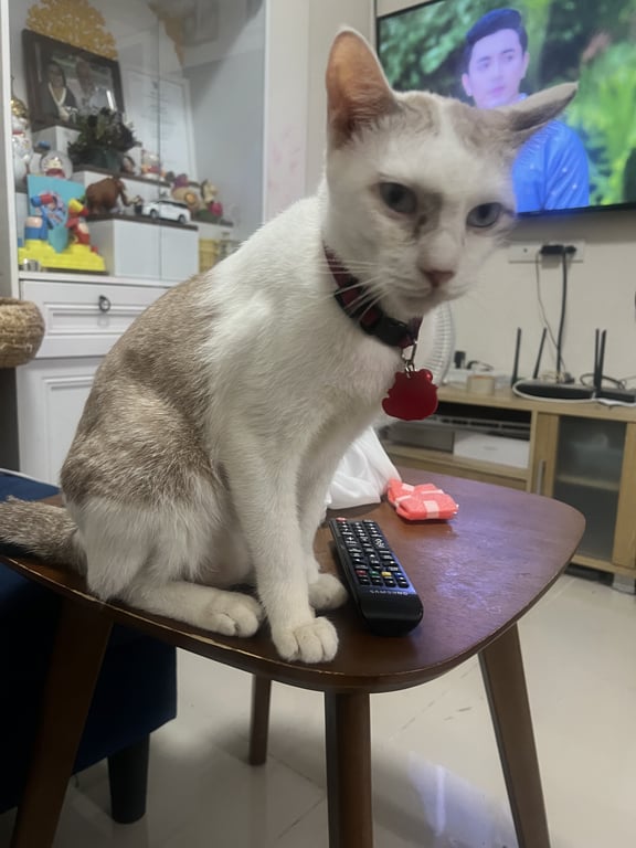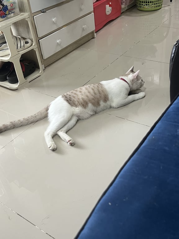 รอยตำหนิ: ลายบนหัว3จุด ตัวสีขาว ครีม มีลาบสลิดเล็กน้อยจมูกดำสีขาว น้ำตาลอ่อน หัวมีลายน้ำตาล3จุด ขี้อ้อน ติดคน ชอบล้มตัวอ้อนแบบสุดชีวิต