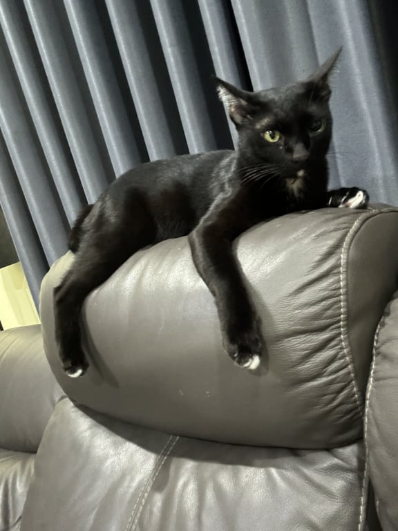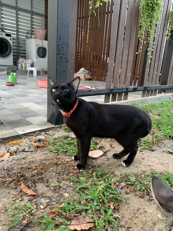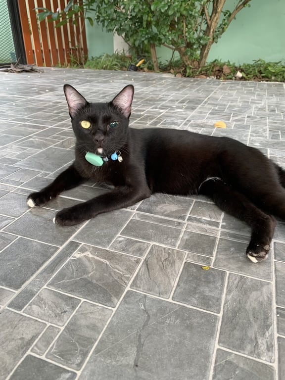 รอยตำหนิ: ตาบอดข้างซ้าย,หางกวักเข้า,มีจุดขาวใต้คางกับจุดขาวที่เท้า 4 จุดค่อนข้างขี้ระแวง,ไม่ค่อยให้คนจับ