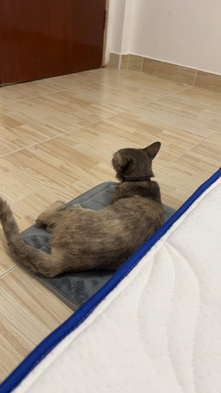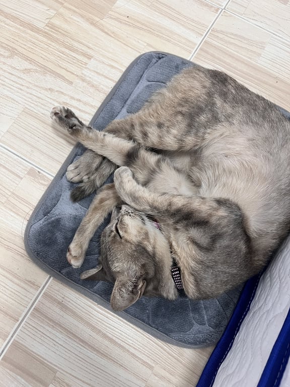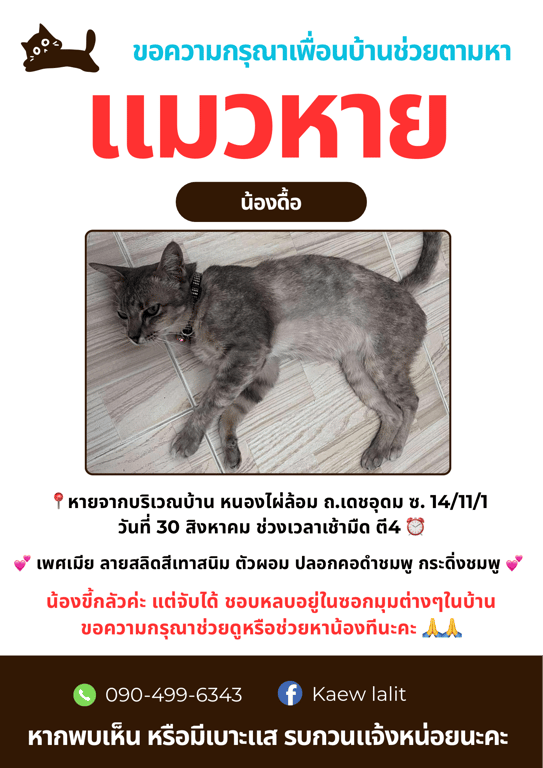 รอยตำหนิ: สีน้องออกสนิมๆหน่อยตัวผอม ขี้กลัว แต่สามารถจับน้องได้ ไม่กัด ใส่ปลอคคอสีดำลายชมพู กระดิ่งสีชมพู