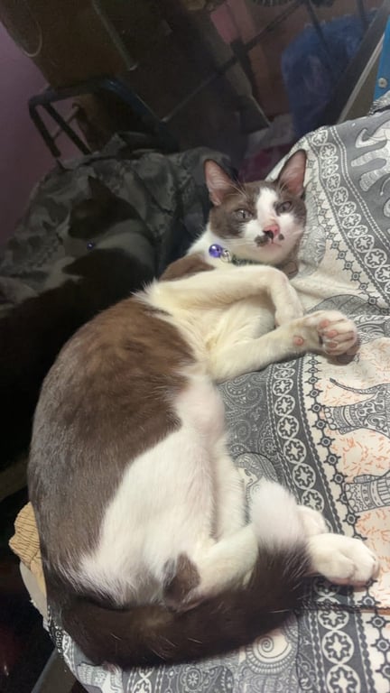 รอยตำหนิ: มีจุดแต้มเหมือนหนวดปลอกขอสีเขียวดำ มีกระดิ่งสีม่วง2อัน น้องค่อนข้างไม่คุ้นคน ชอบแอบ นิสัยดุร้าย