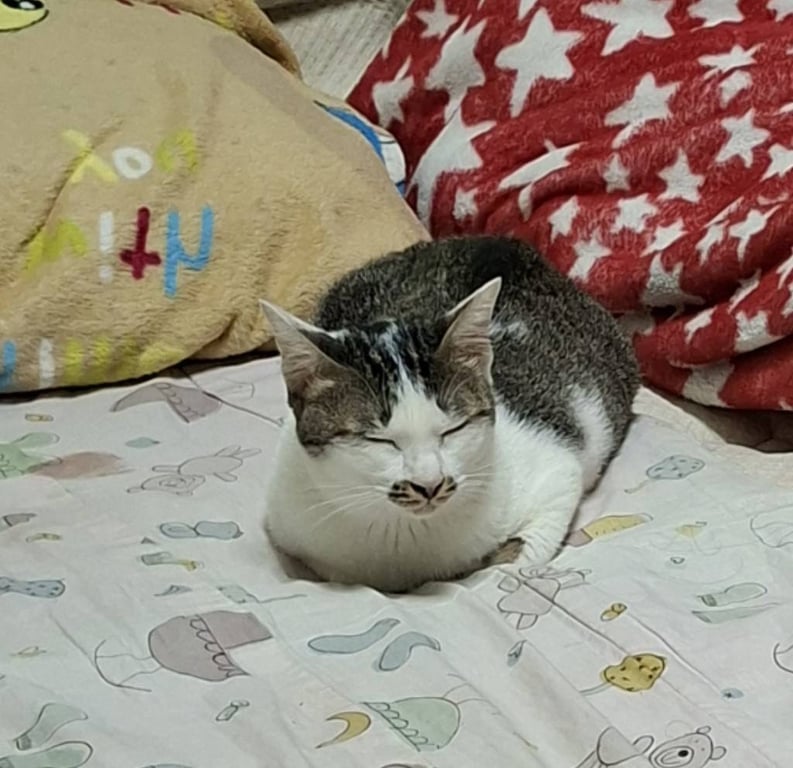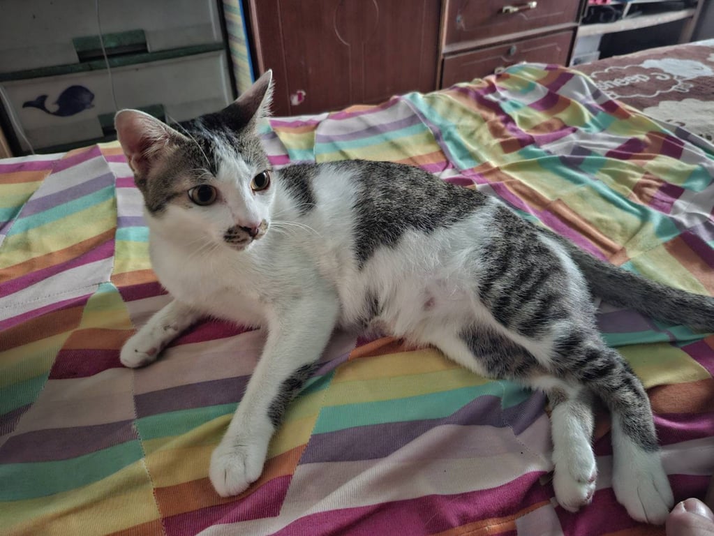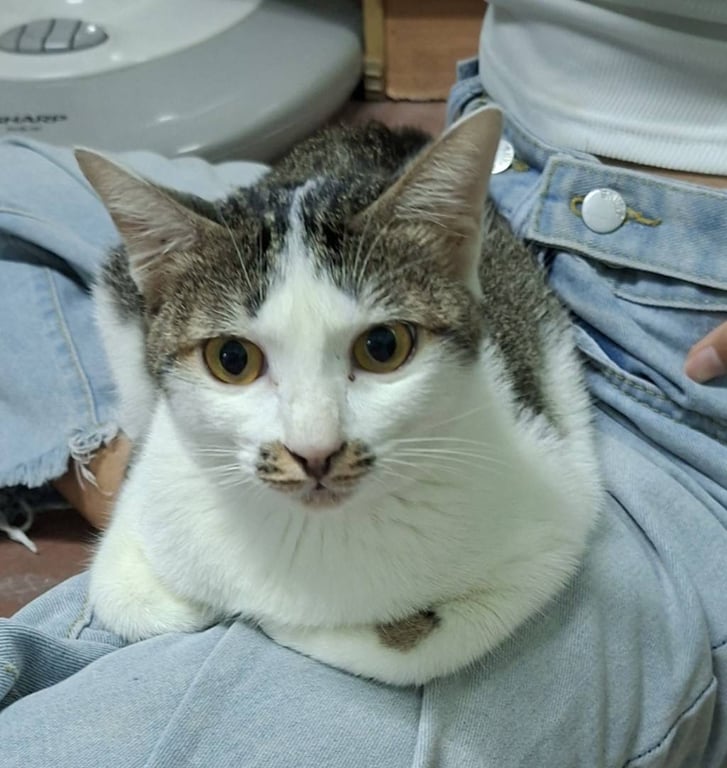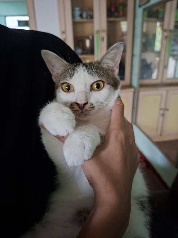 รอยตำหนิ: ที่พุงมีรอยปลาสลิดโดดๆ ที่โคนหางมีสีขาวแซม รอยที่ปากเหมือนปากเลอะตลอดเวลาค่อนข้างกลัวคนแต่ขี้อ้อน เคยเป็นแมวจรจัดมาก่อน ชอบร้องเวลาหิว