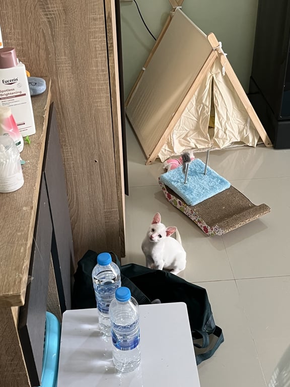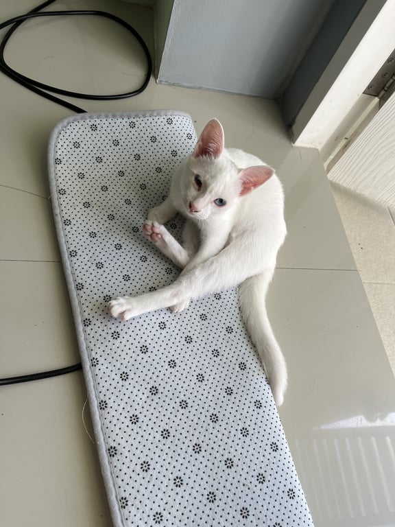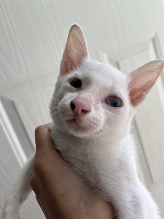 รอยตำหนิ: ตาข้างขวาแหว่ง บนหัวมีขนสีดำเล็กน้อยน้องขี้กลัวมาก ใส่ปลอกคอสีใสสลับฟ้า