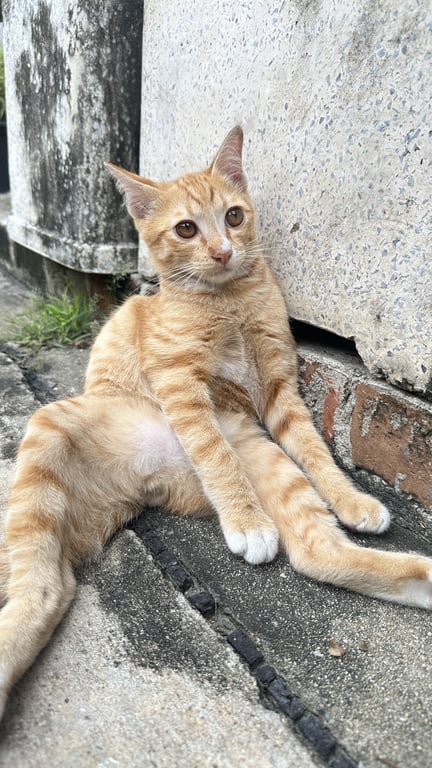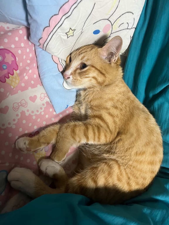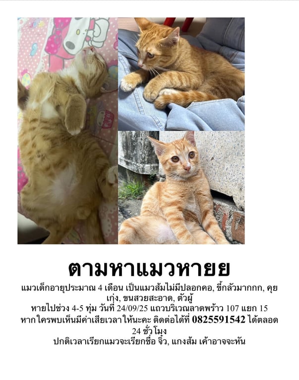 รอยตำหนิ: หัวเล็กตัวอ้วน, สะอาดทั้งตัว, ไม่มีปลอกคอ, ตรงจมูกมรป้านขาวๆ, ขี้กลัวมากๆๆ, เรียบร้อย , คุยเก่ง, เเมวส้มลายสวยน้องเป็นเเมวจรเเถวบ้านที่เลี้ยงอย่างดี (เหมือนเเมวมีเจ้าของ) คือไม่สามารถหากินเองได้ใช้ชีวิตข้างนอกไม่เป็นเพราะจุดที่เลี้ยงเป็นท้ายซอยแบบปิดน้องไม่เคยไปไหนไกลบ้านจึงมีนิสัยขี่กลัวมากๆ วิ่งเร็วหวาดระเเวงคนเเปลกหน้า อาจจะจับได้ยาก เเตาคุยเก่ง หัวเล็กตัวอ้วน หน้าตาใจดีเเมวส้มหลุด QC