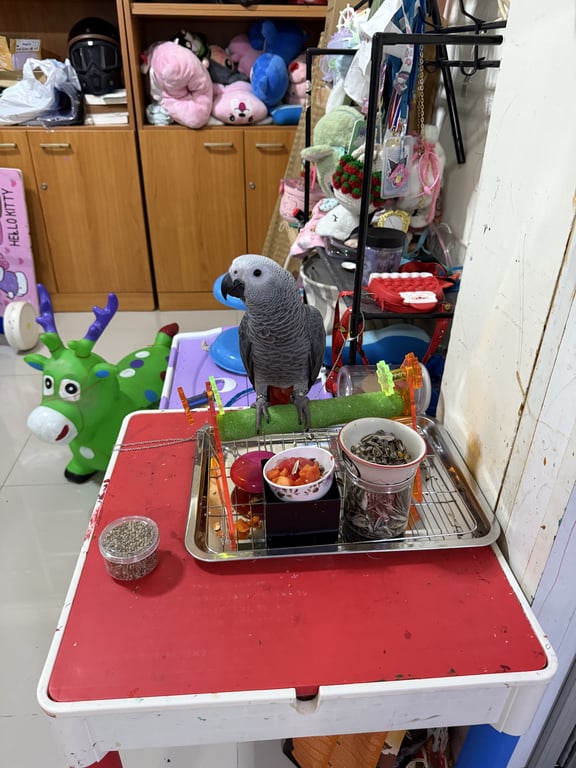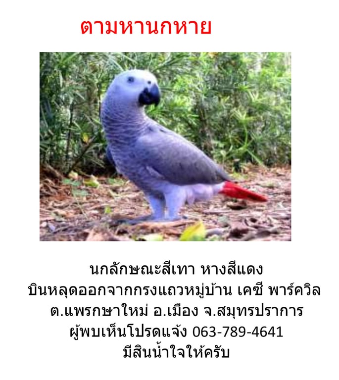 รอยตำหนิ: ตัวสีเทา หางแดงมีห่วงขา และหลุดไปพร้องห่วงจูง