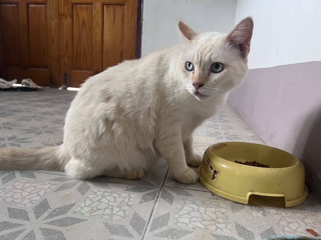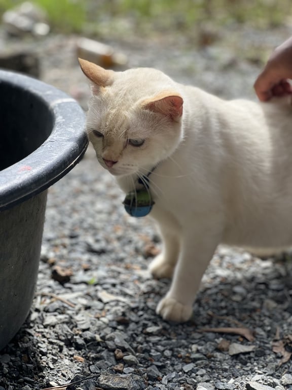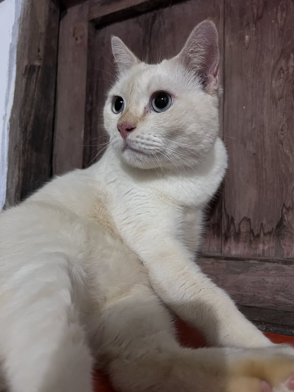 รอยตำหนิ: หางตรงยาวสวยแมวไทยผสม ตัวอ้วน สีขาว เหลืองนิดๆ ตาออกสีฟ้าอ่อนๆ หวงตัว แต่ถ้าคุ้นจะให้อุ้มค่ะ ขี้กลัวบ้าง เป็นมิตรกับหมาแมวที่เลี้ยงไว้ด้วยกัน