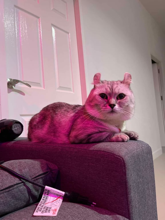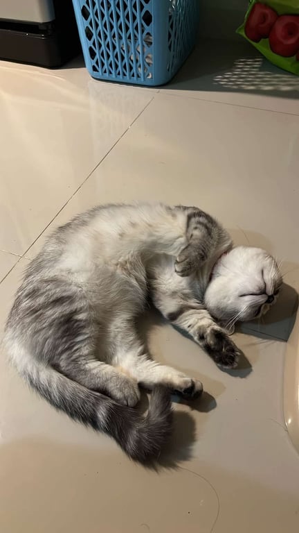 รอยตำหนิ: หูบิ้น ขาสั้น ใส่ปอกคอสีเเดง ขนขาวเทาออกสลิดขี้กลัว
