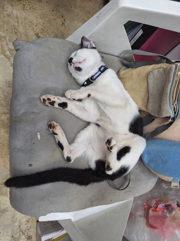 รอยตำหนิ: แมวลายวัว จมูกดำขี้อ้อน เดินไม่ค่อยมั่นคง
