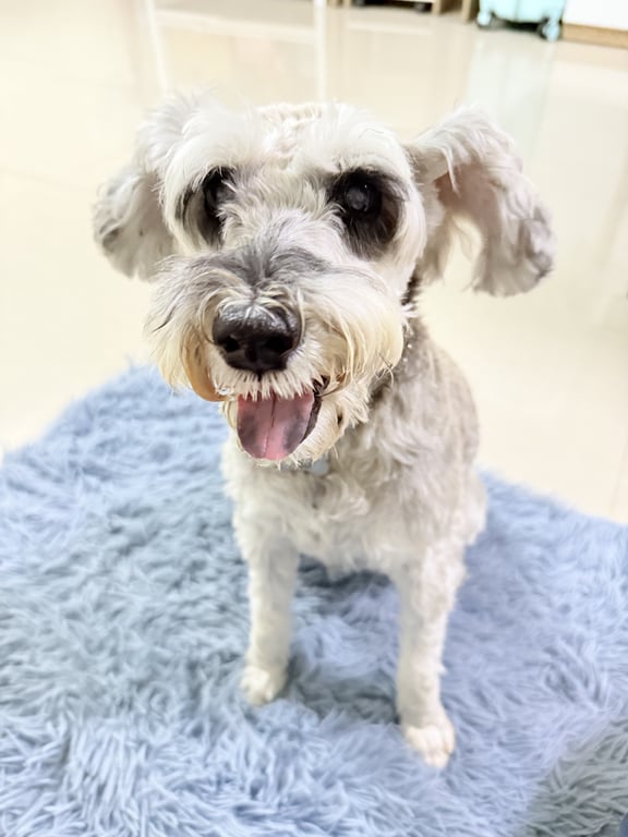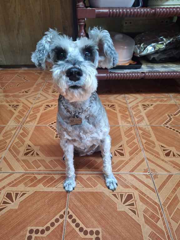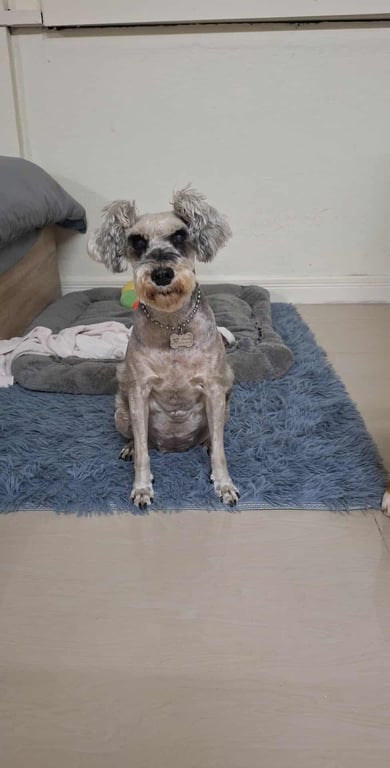 รอยตำหนิ: ที่หน้าออกมีหูดนูนๆมีปลอกคอพร้อมเบอร์โทร 093-2626-559 มีป้ายชื่อ น้องหมาตัวเมียสีเทา อายุ 14 ปี ตัดขนสั้น ขอบตาดำ นิสัยร่าเริงไม่เห่า