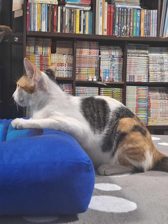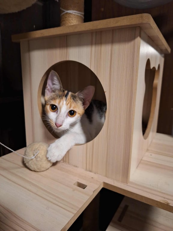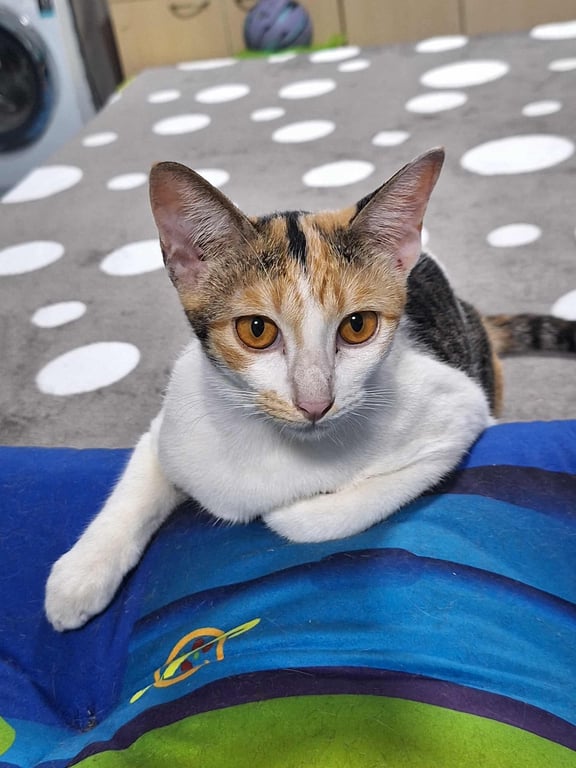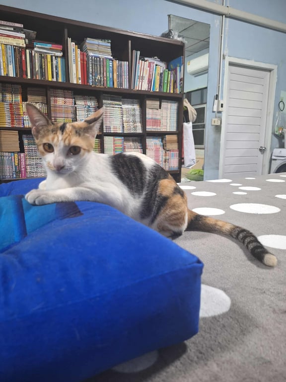 รอยตำหนิ: แมวสามสี พื้นขาว ตาเหลือง ขาหลังข้างซ้ายเจ็บ (ถูกรถทับ)น้องกินเก่ง ร้องเสียงดัง ไฮเปอร์