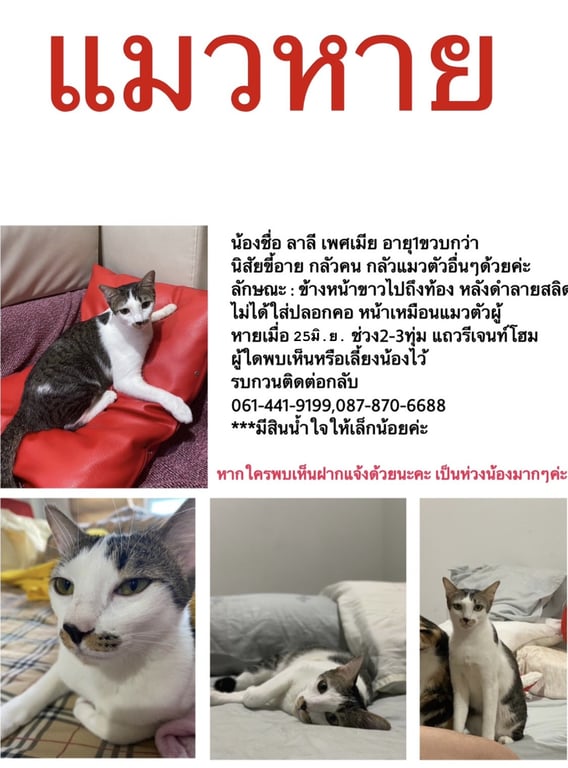 รอยตำหนิ: เท้าขาวเหมือนใส่ถุงเท้าสีขาวทั้ง4ขานิสัยขี้กลัว กลัวคนกลัวสัตว์ทุกชนิด กลัวทุกอย่าง ชอบเล่นออกกำลังกายมากๆ ถ้าอยู่กับคนที่รู้จักจะอ้อน นิสัยน่ารัก ไม่กัดไม่ข่วน