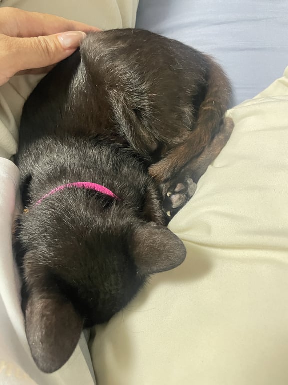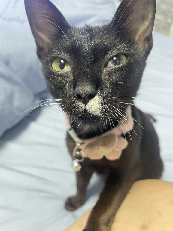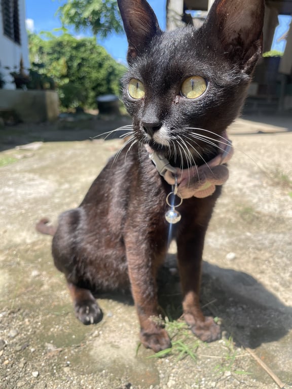 รอยตำหนิ: มีขนสีขาวที่จมูก ตัวสีดำผสมน้ำตาลจิ๋วเป็นแมวจรมาก่อนพึ่งรับน้องมาเลี้ยง จิ๋วเป็นแมวขี้อ้อน ติดคน ชอบแอบเที่ยว