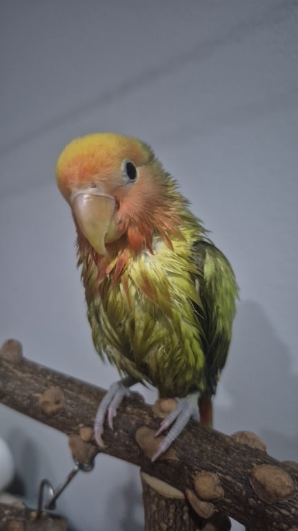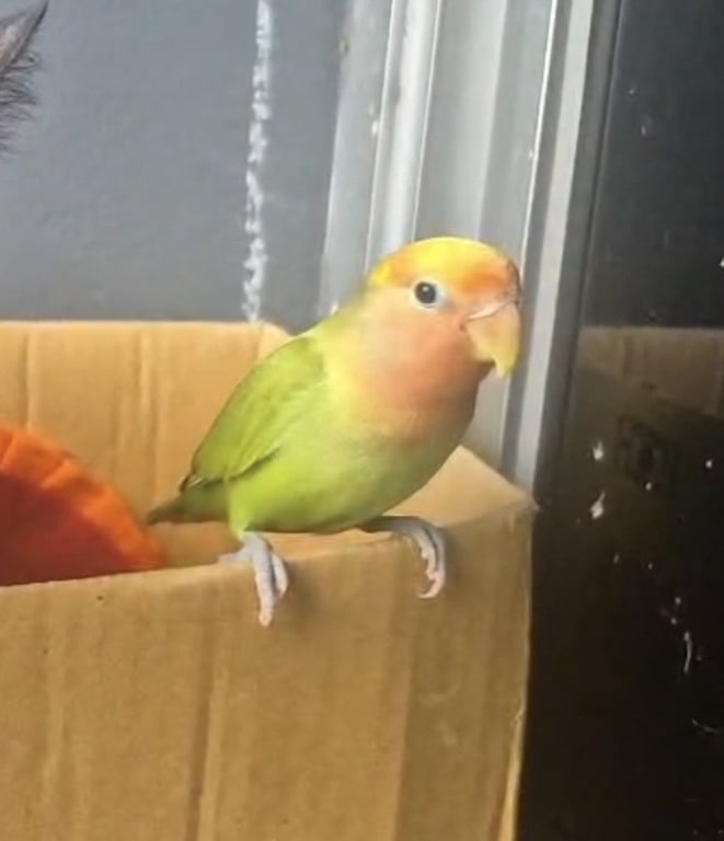 รอยตำหนิ: ตัวสีเขียวอ่อน หัวสีส้มอ่อน ปีกมีรอยกริบทั้ง 2 ข้างน้องไม่ชอบให้จับ แต่ค่อยๆจับได้ น้องกำลลังเห่อปีก พึ่งบินแข็ง