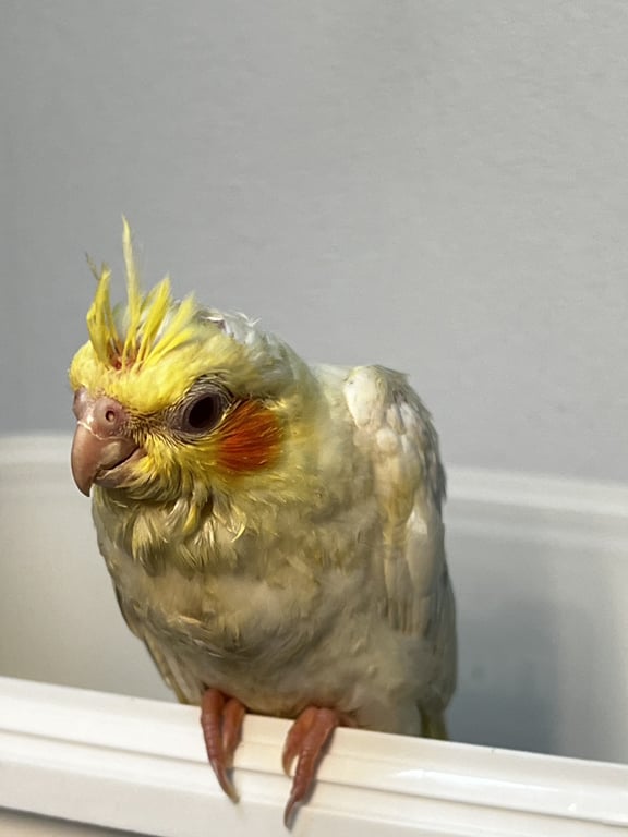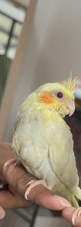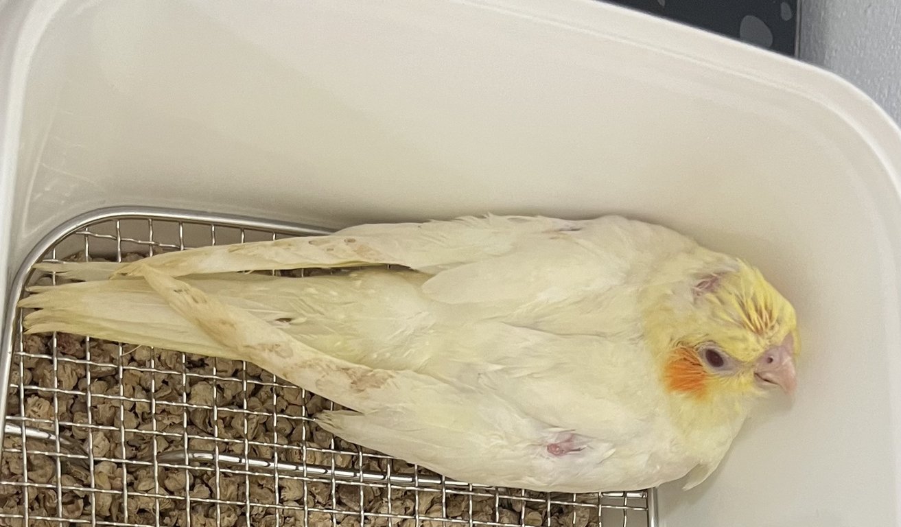 รอยตำหนิ: ขนบนหัวยังขึ้นไม่เต็ม หัวสีเหลืองอ่อน ตัวสีขาวยังเป็นลูกป้อน ไม่มีห่วงขา บินยังไม่แข็ง