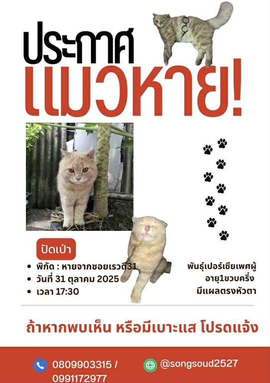 รอยตำหนิ: มีรอยแผลที่คิ้วใกล้ดวงตาเชื่องเข้ากับคนง่าย