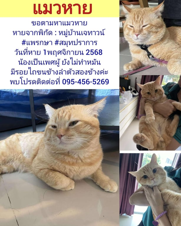 รอยตำหนิ: มีรอยโกนขนข้างลำตัวสองข้างน้องกลัวการวิ่งไล่ หรือไล่ตีค่ะ อย่าพยายามวิ่งเข้าหา ต้องรอให้เค้ามาหาเอง หรือเข้าใกล้ทีละนิดๆ พิกัดหายที่หมู่บ้านเจทาวน์ (ซ 14) #แพรกษา #สมุทรปราการ สถานที่ใกล้เคียง โรงเรียนสารสาสน์วิเทศสมุทรปราการ หมู่บ้านเดอะทรัสต์แพรกษา หาย 1 พฤศจิกายน 2568 เวลา18.30 สีส้มสลิด เพศผู้ ยังไม่ทำหมันค่ะ มีรอยไถขนข้างลำตัวสองข้าง เนื่องจากเพิ่งรักษาตัวหายจากหมากัดค่ะ ไม่สวมปลอกคอขณะหาย(รักษานาน2เดือน เลี้ยงปิดในขณะรักษา ตอนแรกพบเจอเค้าไม่ทราบว่าจรหรือไม่ แต่คิดว่าน่าจะหลงเพราะเคยมีเจ้าของค่ะ) สาเหตุที่หาย เนื่องจาก นำไปส่งบ้านรับอุปการะในหมู่บ้านเจทาวน์ ในวันที่1 พฤศจิ ตอน6โมงเยน แต่ได้รับแจ้งว่าน้องหลุดหาย ตอน6โมงครึ่ง ในวันเดียวกับที่นำส่ง น้องแปลกที่แปลกทาง คิดว่าไม่สามารถกลับบ้านได้เอง น้องไม่ได้หลงเพราะติดสัดค่ะ รบกวนทุกคนถ้าพบเบาะแสของน้องช่วยติดต่อกลับหน่อยนะคะ (ไม่เจอตัว2วันละค่ะ วันที่หายวันที่สิงยังพบอยู่ในโพรงบ้านข้างๆที่น้องหลบหนีออกมา แต่พออีกวันมีคนพบเจอเลยวิ่งหล่ตามจับ เลยทำให้น้องหนียังไม่พบค่ะ ไม่ทราบว่าหลุดไปจากหมู่บ้านมั้ย)