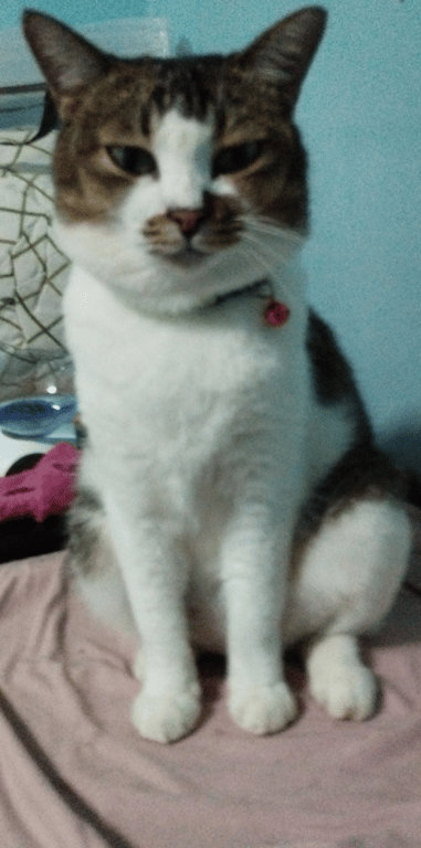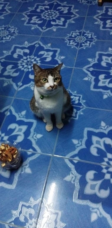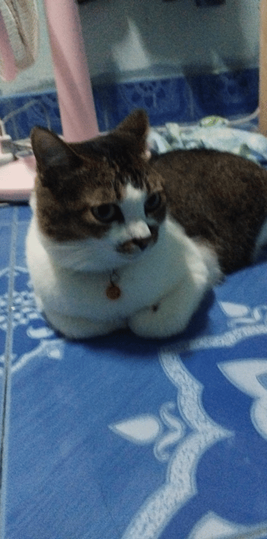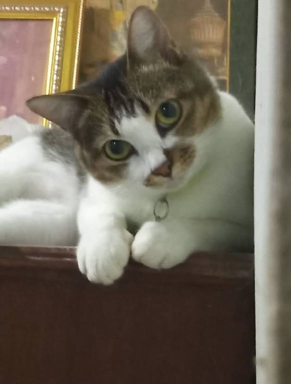 รอยตำหนิ: มีสีน้ำตาลทรงกลมรอบจมูกและปากใส่ปลอกคอสีเขียวกระดิ่งสีชมพูม่วง น้องค่อนกลางกลัวคน กลัวเสียงรถ
