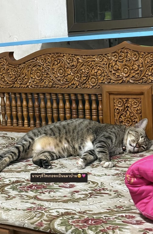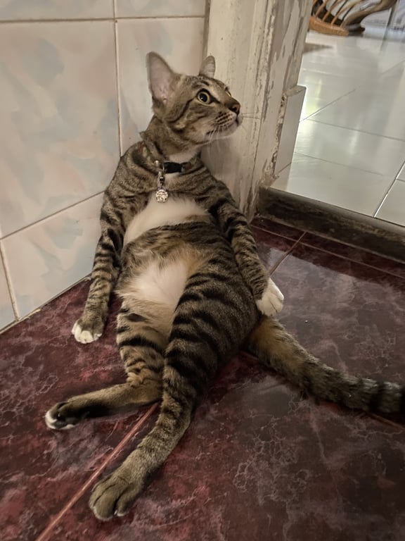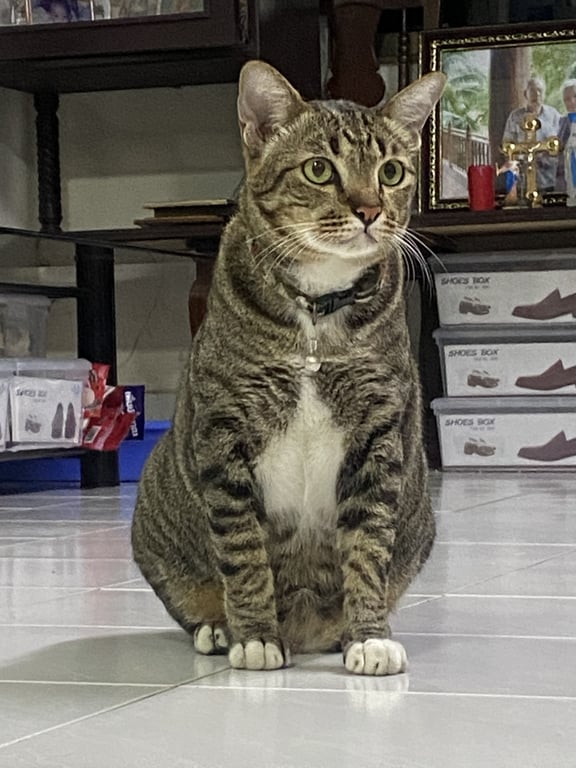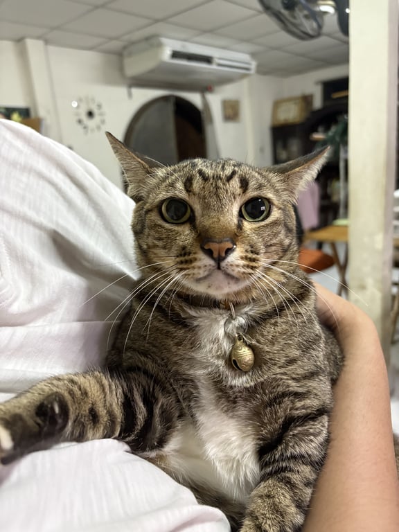 รอยตำหนิ: มีรอยแหว่งที่หูซ้ายแมวลายสลิด ขี้กลัวมากๆ รูปร่างค่อนข้างอ้วนและตัวใหญ่แต่ใจดี