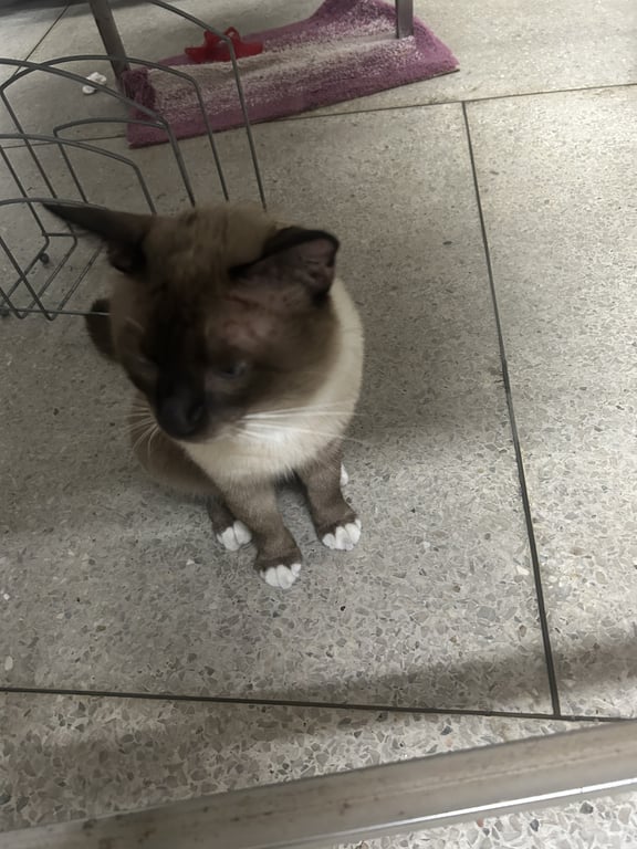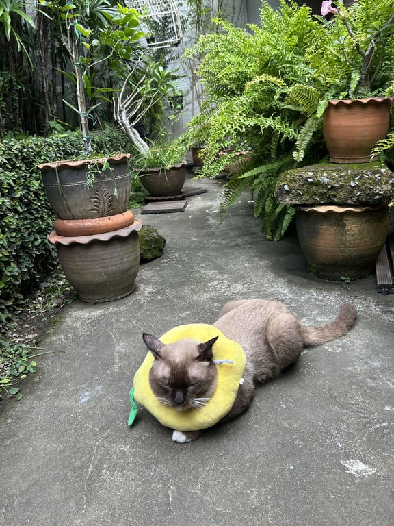 รอยตำหนิ: ขาขวาหน้า มีแผลพันแผลไว้รอบขา ใส่คอลลาพลาสติกใสไม่เอาคนแปลกหน้า ใจดี ไม่ดุ ไม่ขอบเสียงดัง ตกใจวิ่งหนี