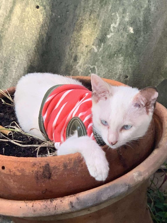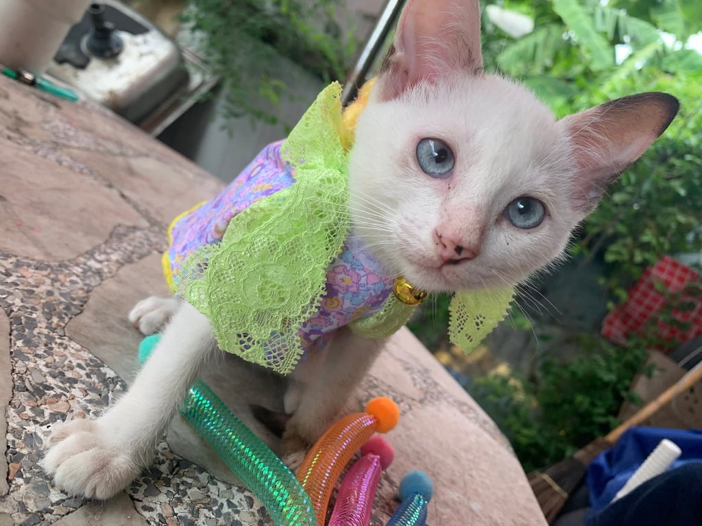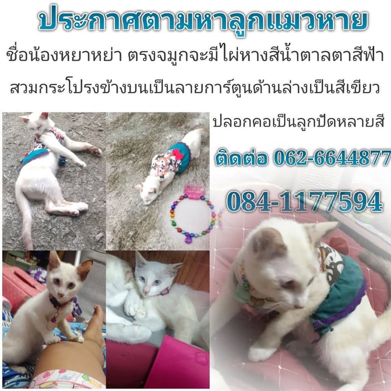 รอยตำหนิ: ตรงจมูกจะมีไฝ ตาสีฟ้า สวมชุดกระโปรงแบบในภาพ ปลอกคอลูกปัดหลากสีตรงจมูกจะมีไฝ ตาสีฟ้า สวมชุดกระโปรงแบบในภาพ ปลอกคอลูกปัดหลากสี ขี้เล่นเจากับคนง่ายมากคะ
