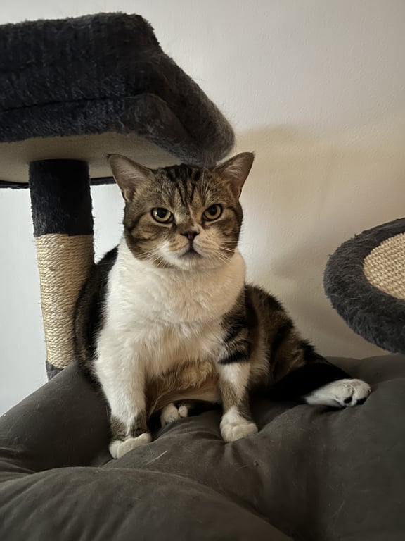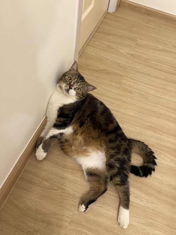 รอยตำหนิ: ลายสลิด คอสีขาว อ้วนนิสัยดี ไม่ดุ อ้อนเก่ง ไม่กลัวคน