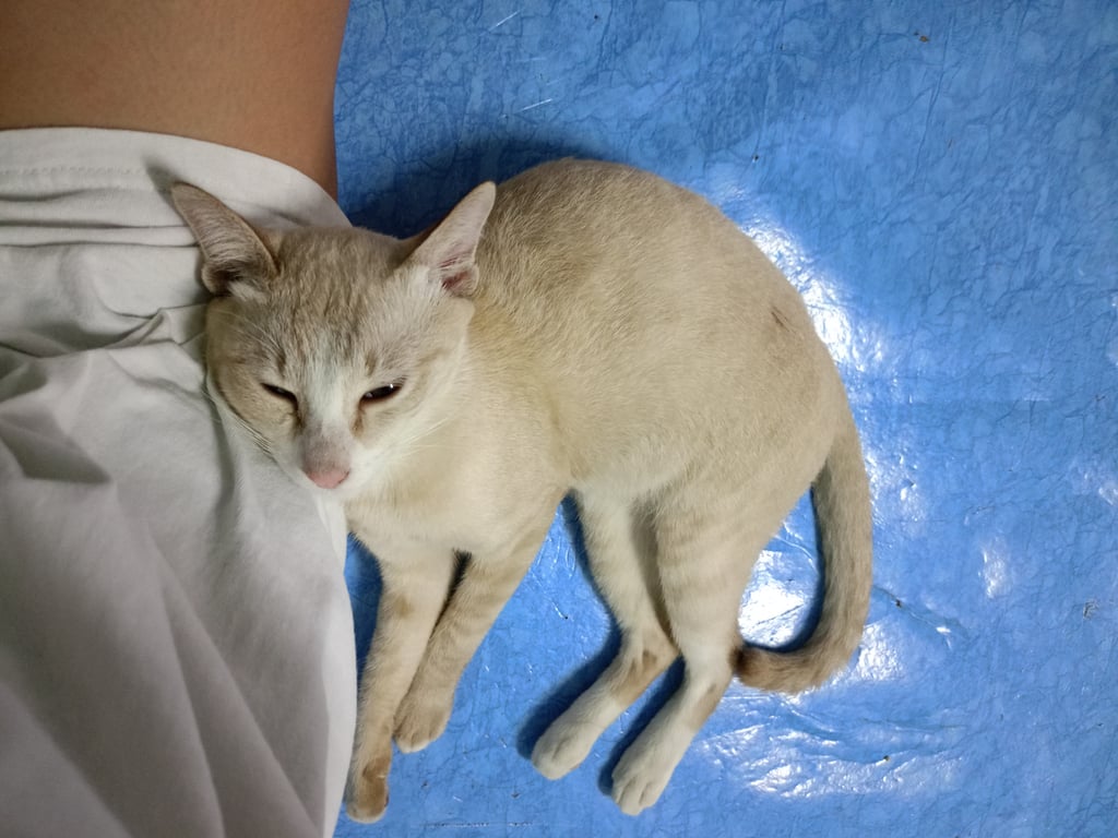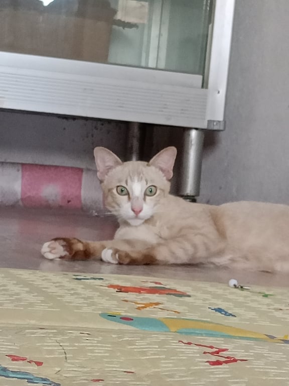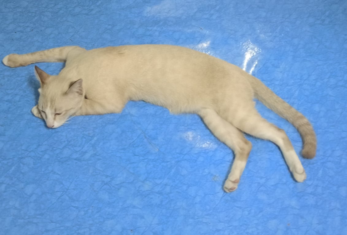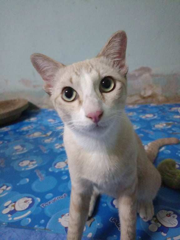 รอยตำหนิ: หางยาว ใส่ถุงเท้าข้อสั้น หลังหู เท้าและปลายหางเป็นสีน้ำตาลขนสีครีมขาว ตาสีเหลือง หางยาว นิสัยขี้กลัว กลัวแมวด้วยกัน ขี้ระแวง ชอบร้อง