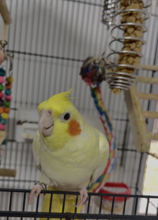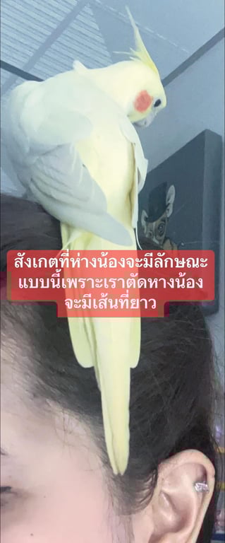 รอยตำหนิ: สีเหลืองล้วนแก้มส้ม ใส่ห่วงขาข้างขวาหากินเองไม่เป็น ชอบร้องเสียงดัง บินไม่เก่ง
