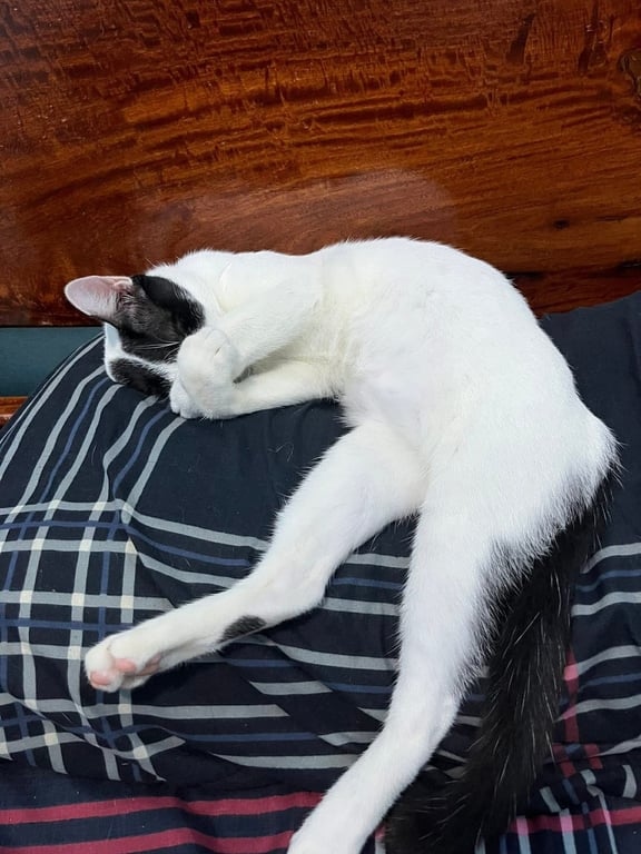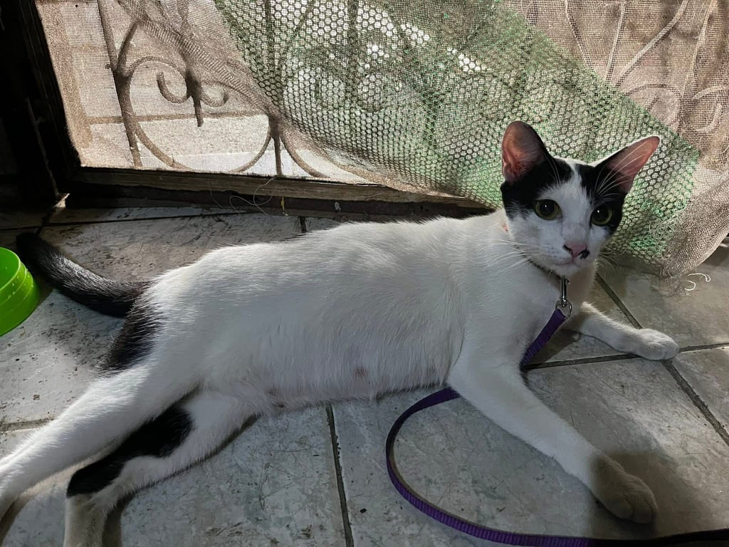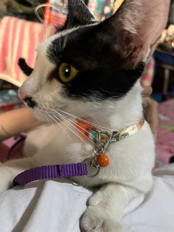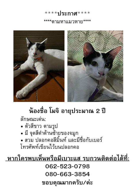 รอยตำหนิ: มีจึดดำที่ข้างจมูกซ้ายมีปลอกคอสีมิ้นที่ปลอกคอมีชื่อของเเมวเเละเบอร์โทรติดต่อเจ้าของอยู่