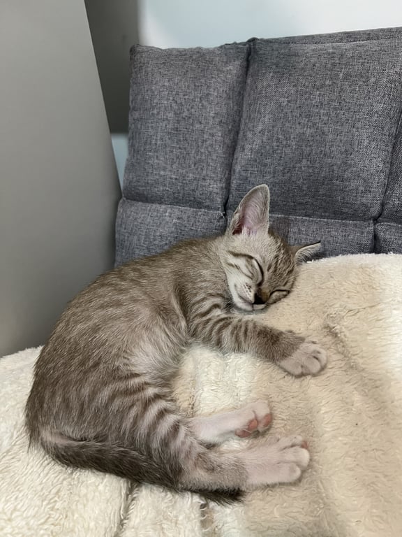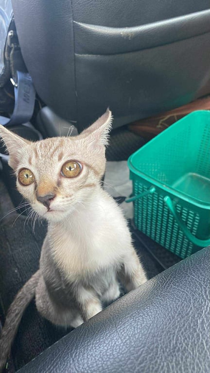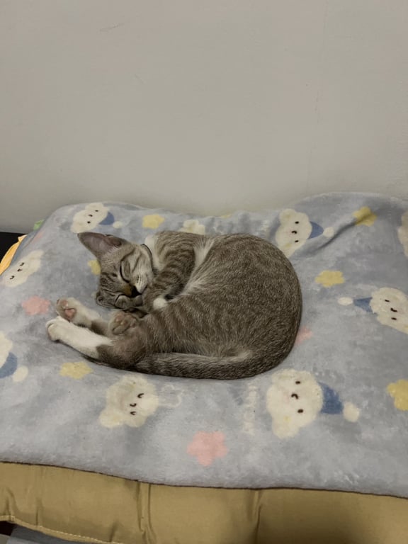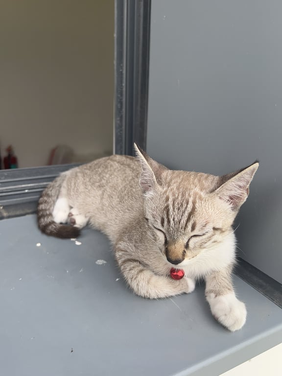 รอยตำหนิ: แมวสีเทาหางยาวใส่ปอกคอเปลี่ยนสีและลูกกระพรวนสีแดงเป็นแมวขี้เล่น อ้อนนิดๆหน่อย ฉลาด และเชื่อง