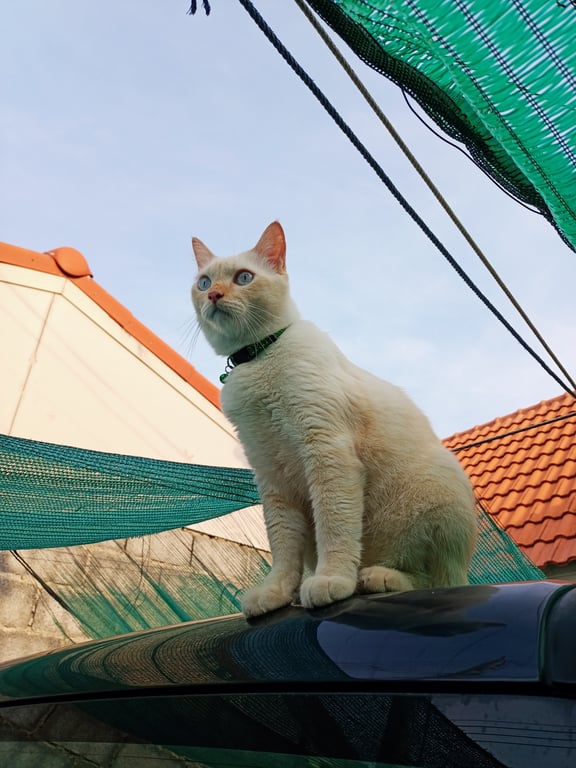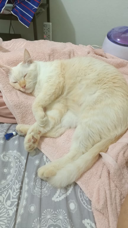 รอยตำหนิ: สีขาวครีม ตาสีฟ้าอ่อนกลัวคน กลัวเสียงดัง มีโรคประจำตัว: กระเพาะปัสสาวะอักเสบ