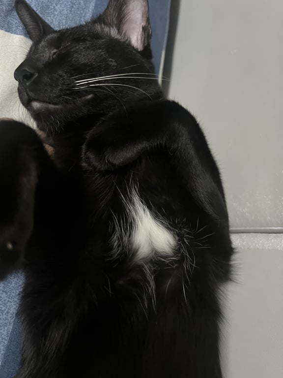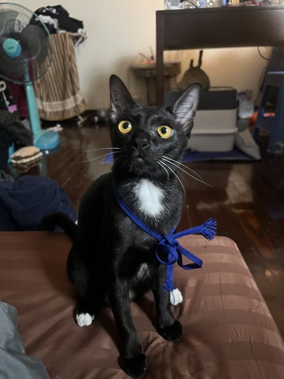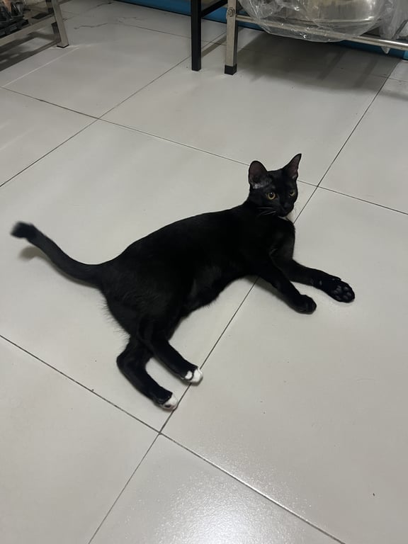 รอยตำหนิ: ตาสีเหลือง มีปลายถุงเท้าขาวที่ขาหลัง หางมีตำหนิ เหมือนหักปลาย มีลายขาวอกบน และมีลายเหมือนลาเต้อาต ตำลงมาอีกจุดติดคน ปกติกลัวเสียงรถ เสียงมอไซ นอนในบ้านตลอด ไม่ค่อยเข้ากับแมวตัวอื่น จะตบอย่างเดียว