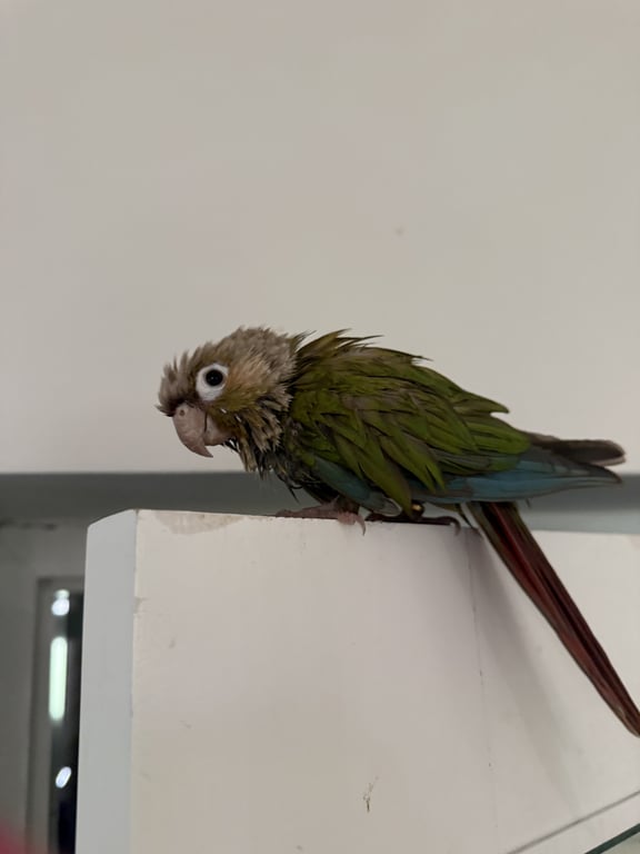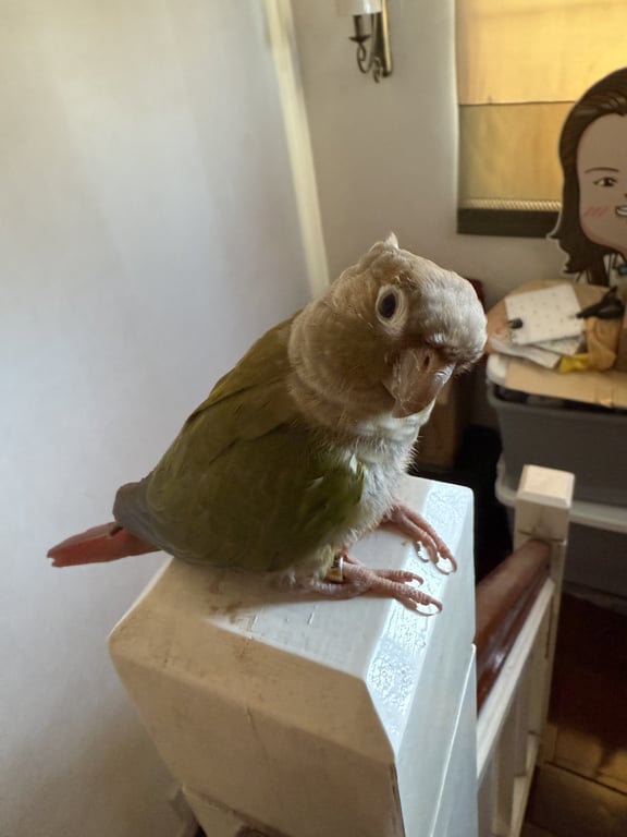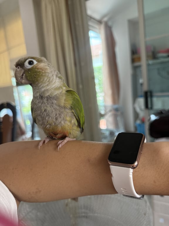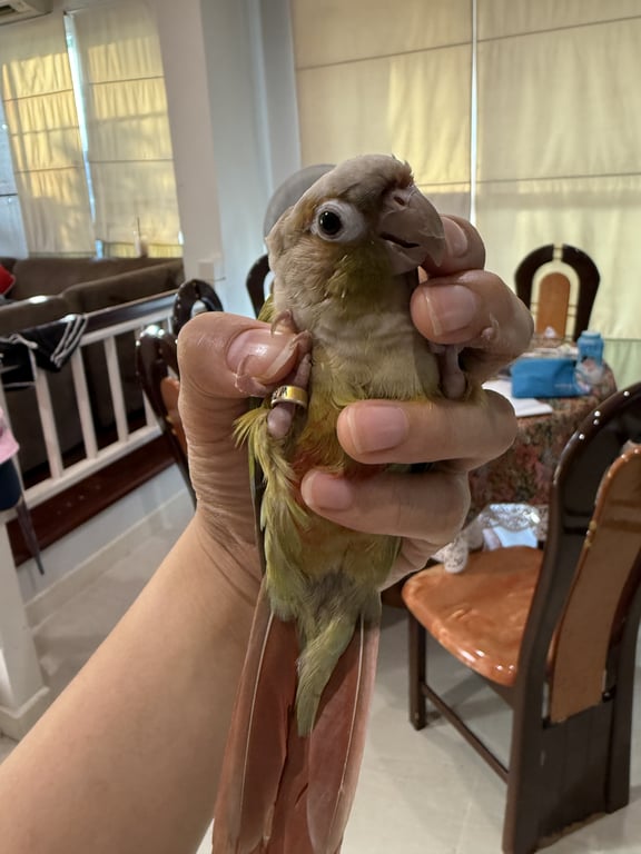 รอยตำหนิ: จมูกด้านขวามีรอยใหญ่กว่าปกติน้องหลุดมาและรับเลี้ยงไว้ น้องไม่ใช่นกติดคน น้องกลัวมือคน แต่ชอบเกาะขอบมือถือ ถ้าเอามือถือไปรับน้องจะมา น้องชอบกินผลไม้มากๆ โดยเฉพาะมะม่วง มีห่วงขาสีทองหม่นๆ
