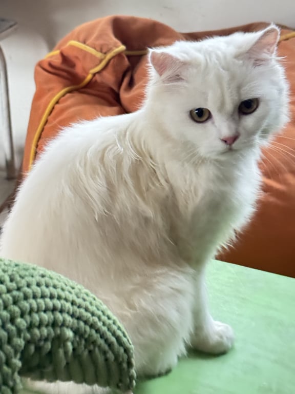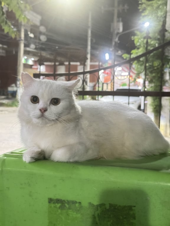 รอยตำหนิ: หูซ้ายแหว่งตาสีเหลือง ขนสีขาว ตัวไม่ใหญ่ ขี้ตกใจ ขี้กลัว