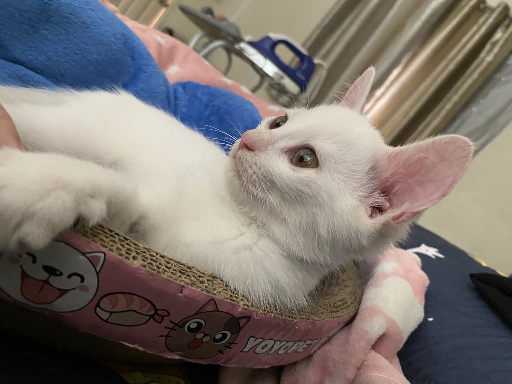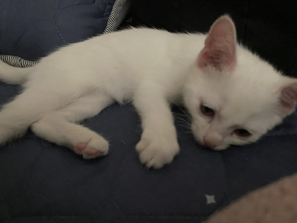 รอยตำหนิ: ขาวทั้งตัว ตาสีน้ำตาล จมูกดำนิดนึ่งกินเก่ง กินแบบตะกะ ติดคนมากก ขี้อ้อน แต่คนข้างขี้งอแงนิดหน่อย