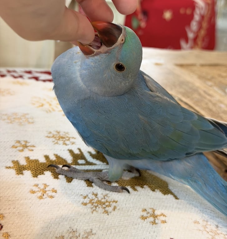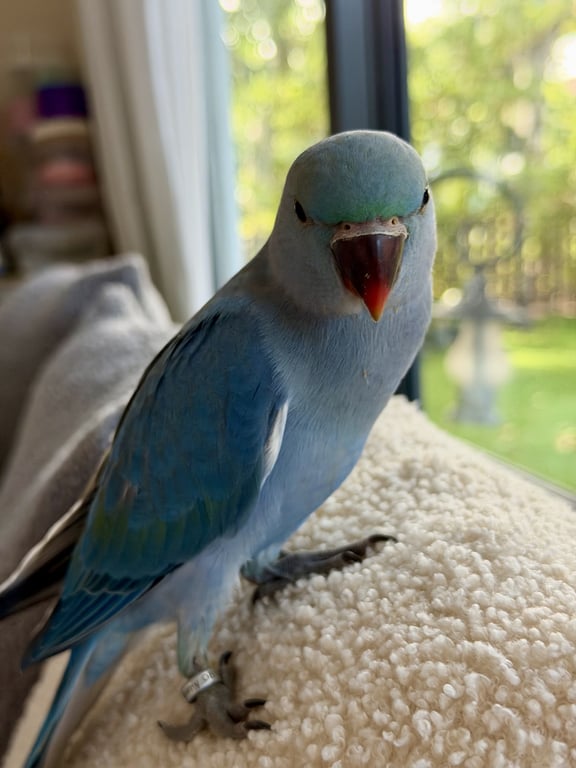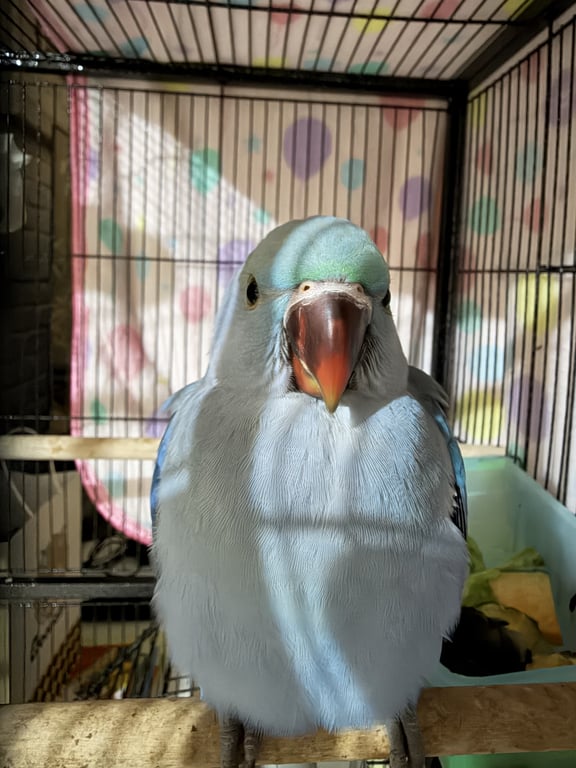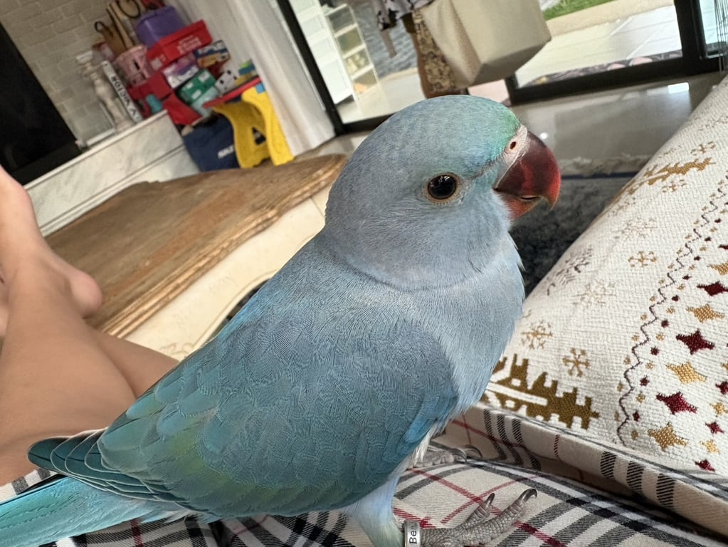 รอยตำหนิ: หน้า และปีก มีเขียวปนนกแก้วริงเนค เพิ่งจะบินเป็นได้ไม่นานนิสัยใจดีกับทุกคน