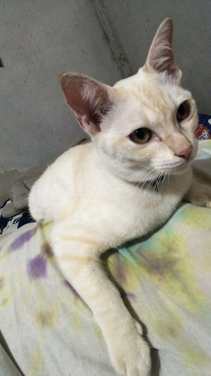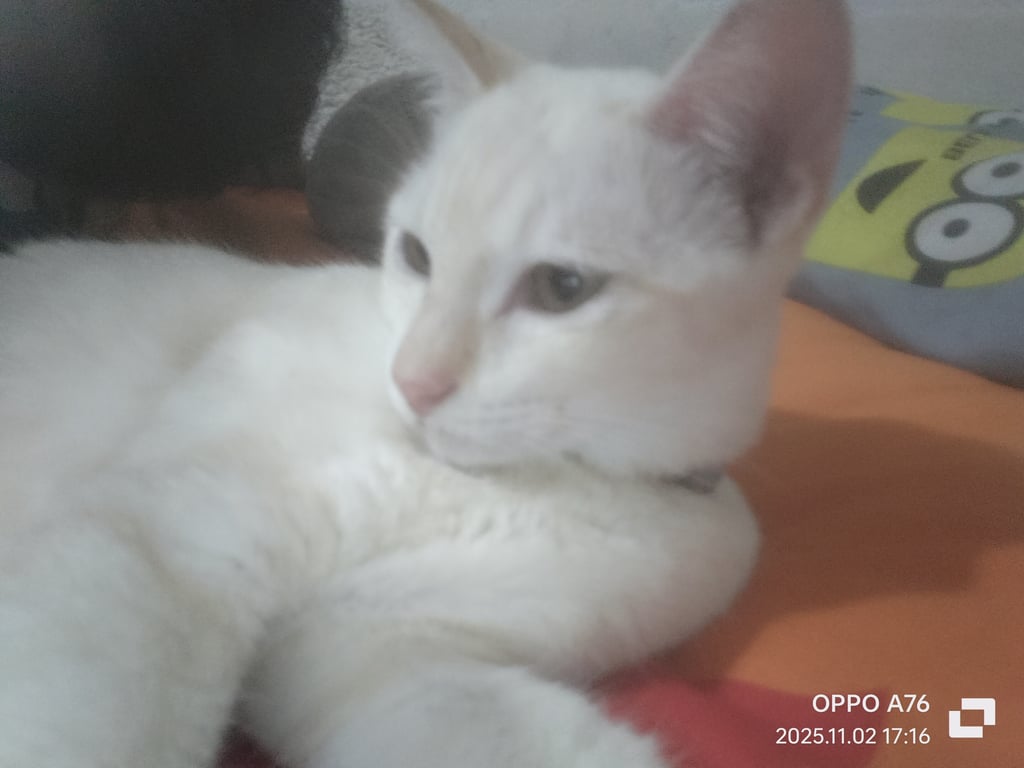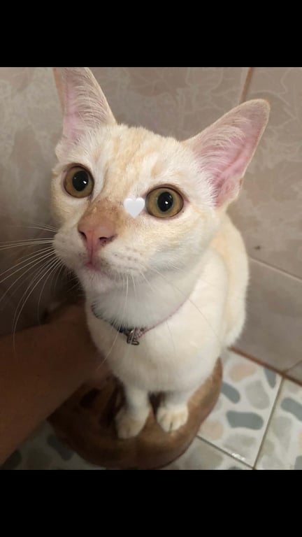รอยตำหนิ: ลายสีเหลืองอ่อนๆ มีปลอกคอสีฟ้าขี้อ้อน ชอบนอน นิสัยดี