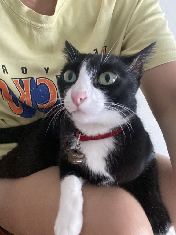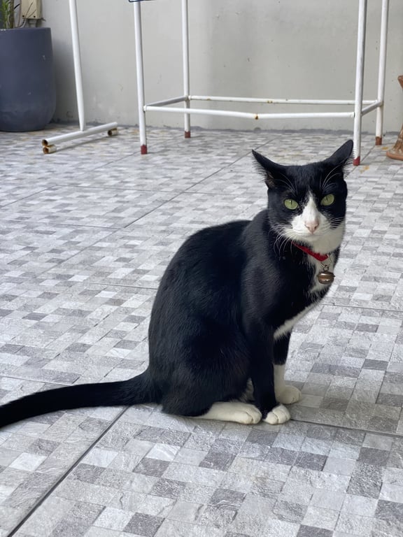 รอยตำหนิ: หน้าแฉกแหลมสีขาว ถุงเท้าสีขาวไม่เท่ากัน ท้องขาว ปลอกคอแดงหยิ่ง ขี้กลัว อยากรู้อยากเห็น