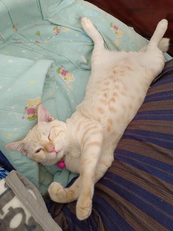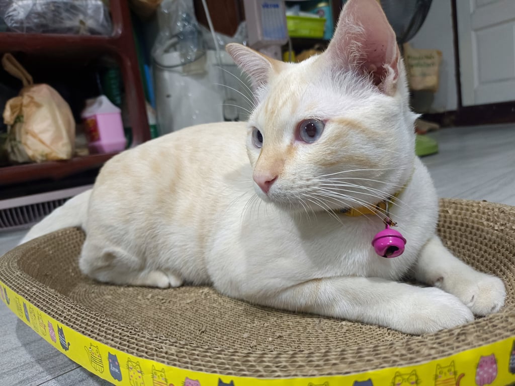 รอยตำหนิ: หางกวัก หน้าผากเป็นรูปตัว Mเป็นแมวที่ขี้กลัว ค่อนข้างกลัวคนแปลกหน้า