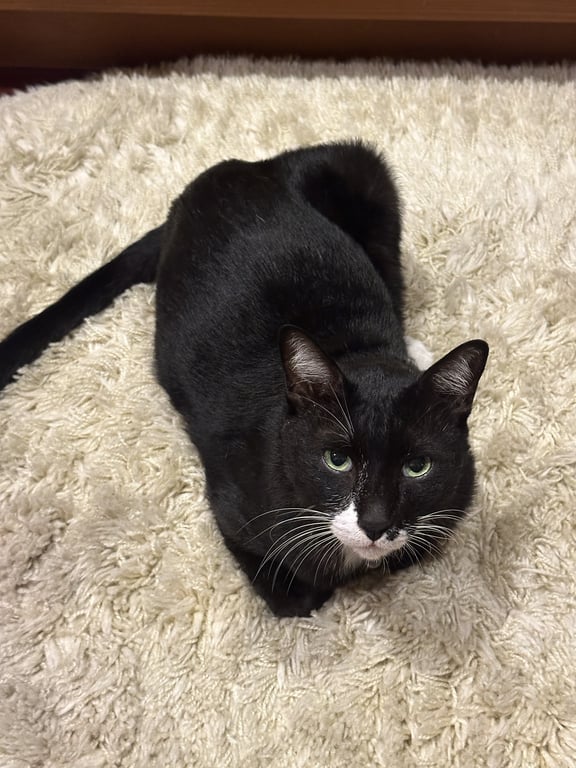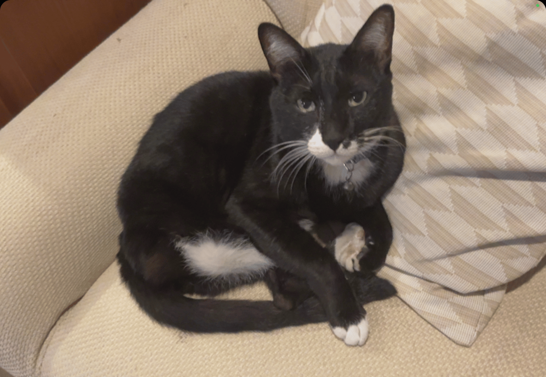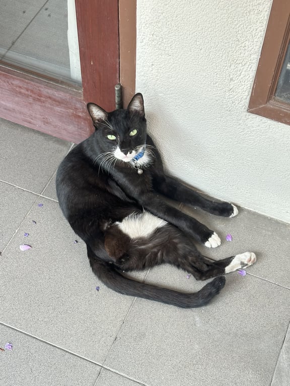 รอยตำหนิ: มีสามขามีสามขา สีดำแต้มขาว เท้าสีขาว ปลอกคอสีสดใส