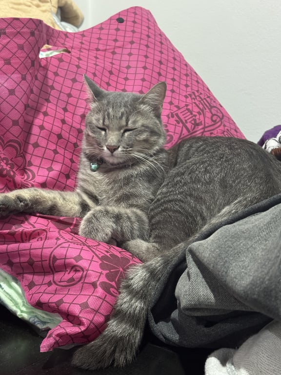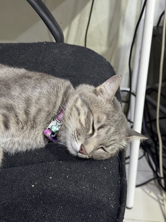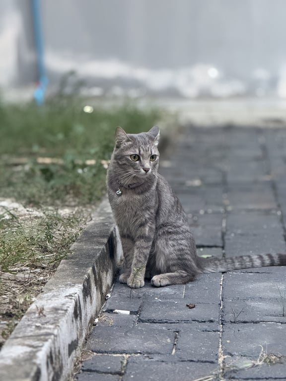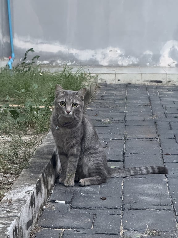 รอยตำหนิ: แมวลายสลิดสีเทาตัวไม่ใหญ่มาก มีปลอกคอสีม่ววกระดิ่งสีเขียว