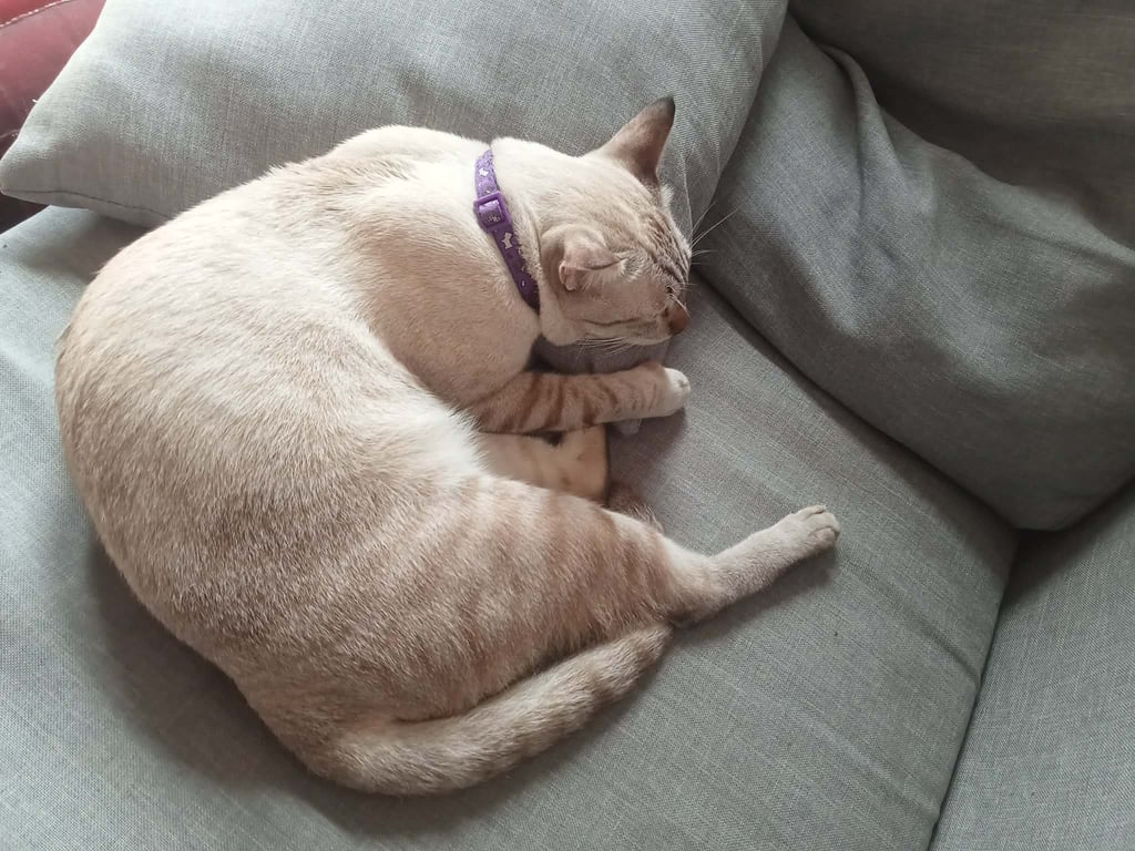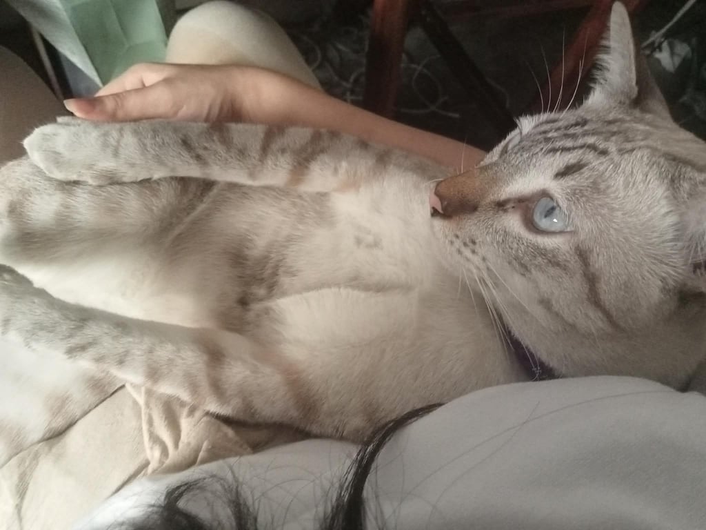 รอยตำหนิ: ตาขวาและบนหูซ้ายมีรอยเล็บจากการต่อสู้เล็กๆสีตัวเปลี่ยนได้ตามอากาศ หนาวจะเข้มขึ้น ร้อนจะออกน้ำตาล ครึ่งตัวสีขาวนวล ครึ่งหลังเป็นลายสลิด หางยาวเป็นลายสลิดที่ไล่สีเข้มขึ้น ขายาว ตัวยาว ตาเป็นสีฟ้าอ่อน คล้ายตาน้ำข้าว นิสัยขี้กลัว กลัวรถ กลัวคนแปลกหน้า แต่สู้กับแมวเก่ง ชอบหลบอยู่ใต้สิ่งของ ท้องรถ ชอบนอนหงายถ้ารู้สึกสบายใจ นิสัยขี้สงสัย เวลารู้สึกอะไรจะแสดงออกทางสีหน้าท่าทางชัดเจน ฉลาด พูดรู้เรื่อง กินยาก ไม่ชอบกินเม็ด แต่ชอบกินปลา ไม่ชอบกินเปียกประเภทเพาซ์