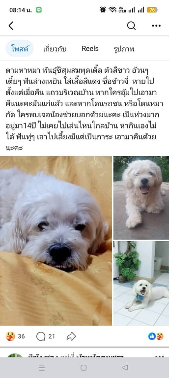 รอยตำหนิ: ฟันล่างเหยิน🙏ชิสุห์ผสมพุดเดิ้ล สีขาว เพศผู้ ฟันล่างเหยิน อายุมาก หายคืนวันที่ 6 ม.ค.69 ช่วงเวลาประมาณ 3 ทุ่ม ใส่เสื้อสีแดงตอนหายค่ะ 🙏พิกัด บ้านสวนแถวๆ ห่างจากมหาวิทยาลัยราชภัฎสามพร้าว อุดรธานีประมาณ 6-7 km. 🙏ติดต่อ บูม(เจ้าของน้องหมา) 092-7084249 ค่ะ