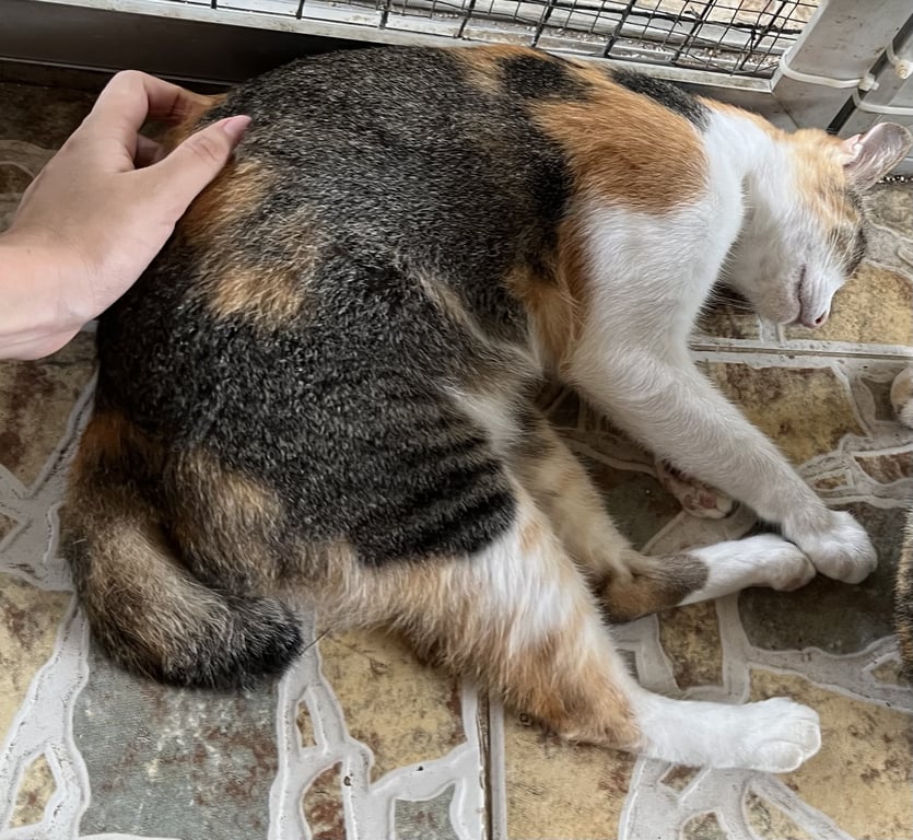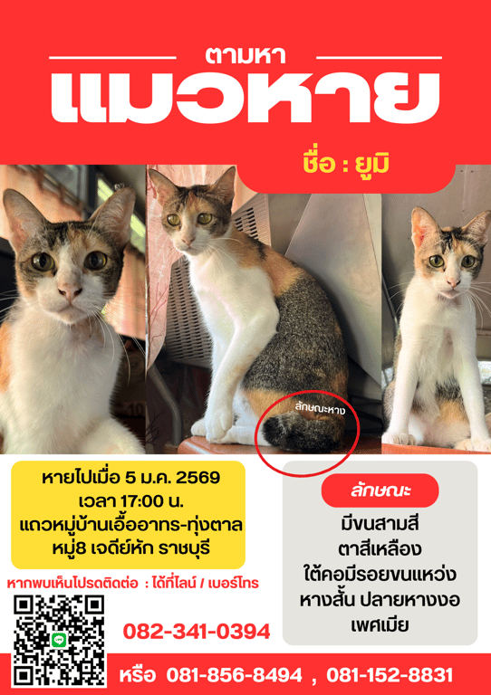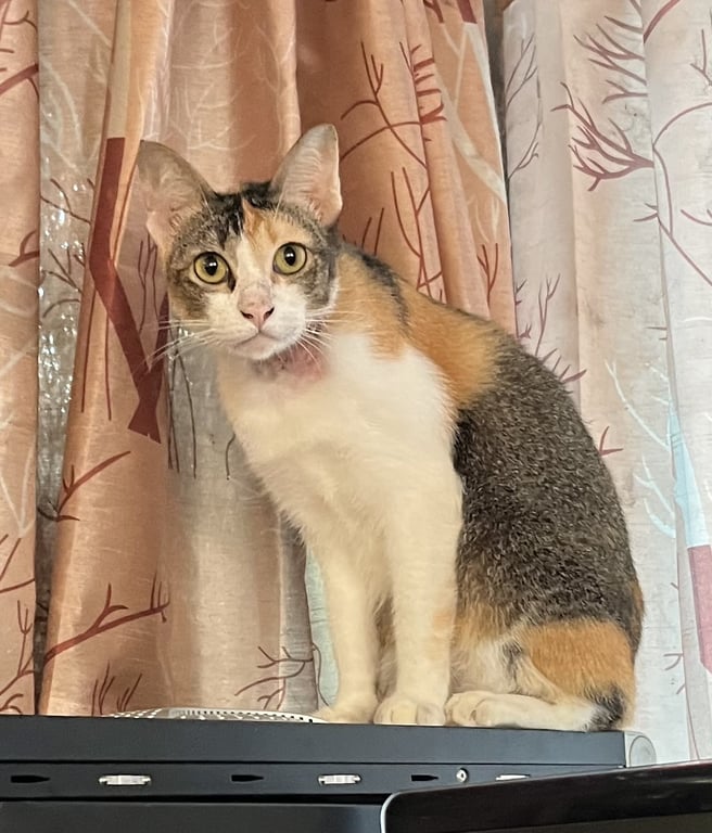 รอยตำหนิ: แมวขนสามสี ตาสีเหลืองอมเขียวเล็กน้อย มีหางค่อนข้างสั้น ปลายหางงอ ใต้คอมีรอยขนขนแหว่งน้องเป็นแมวฉลาด บางทีชอบคาบบอลมาให้ ชอบอ้อนเสียงน่ารักตอนขออาหาร และซน