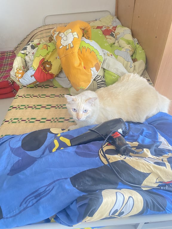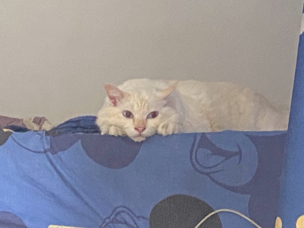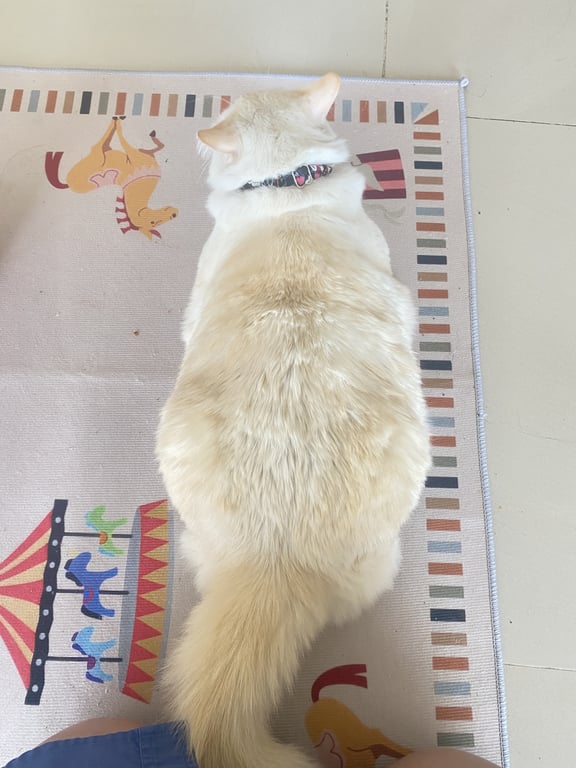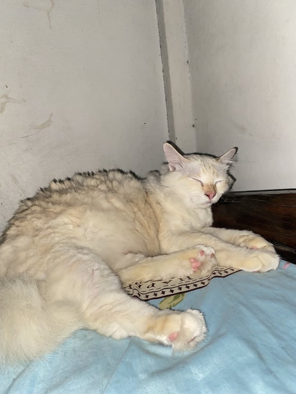 รอยตำหนิ: อ้วน ตาสีฟ้า ขาวออกเหลืองๆเหมือนมีลายส้มสลิดแซมกลัวคนมาก กลัวทุกอย่าง ชอบขู่