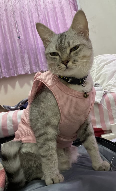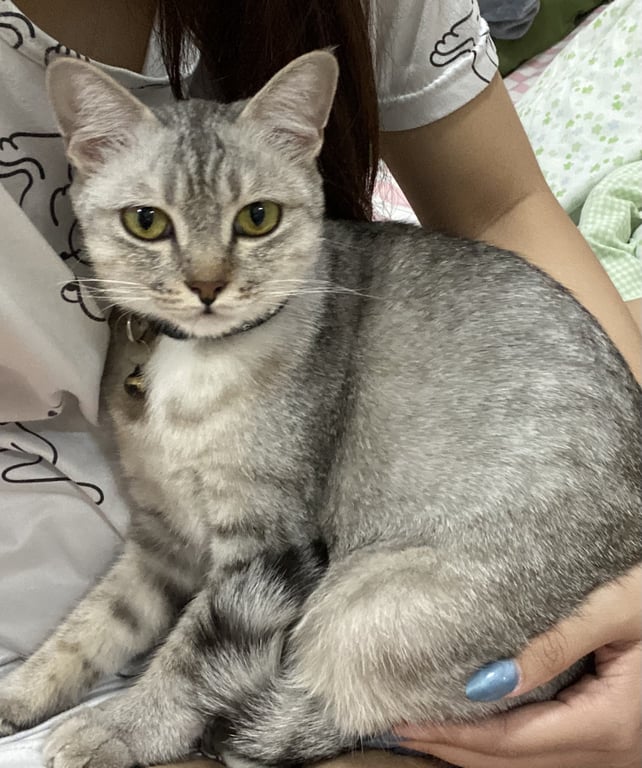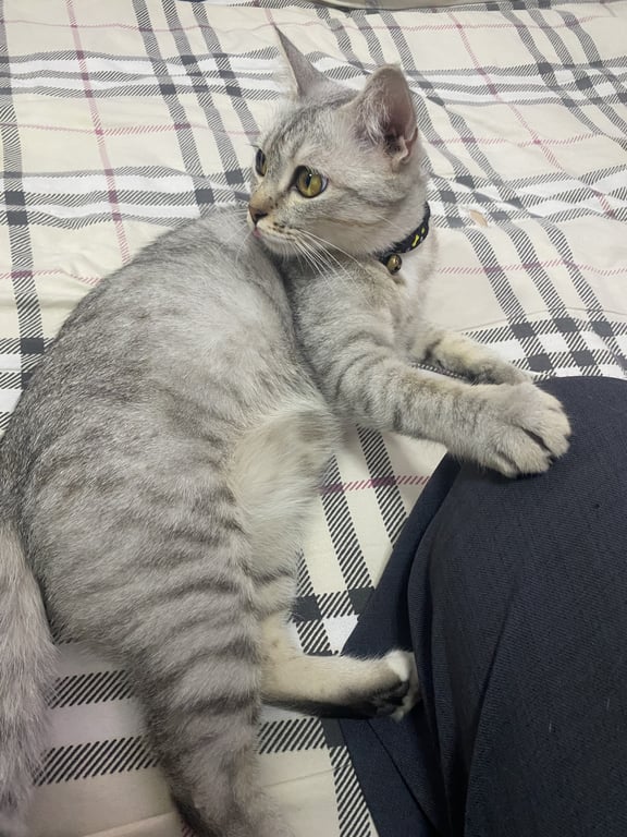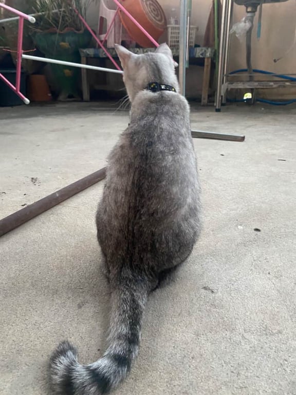 รอยตำหนิ: ใส่ปลอกคอสีดำ สีขนขาวเทาขี้กลัว