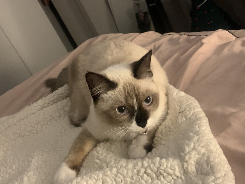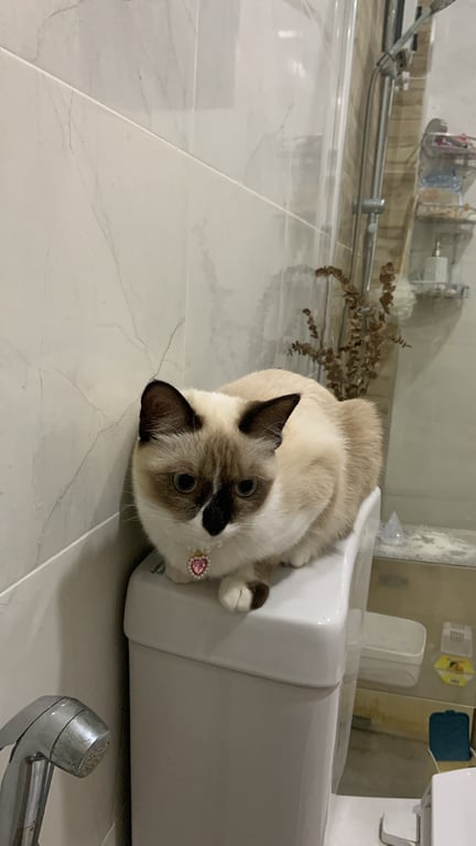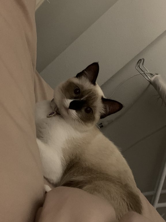 รอยตำหนิ: หน้าไหม้ ปากขาว หูดำ หางดำ ขาดำใส่ถุงเท้าขาว มีขีดสีขาวตรงจมูกเคยเป็นแมวจรมาก่อน พามาเลี้ยงระบบปิดได้ 4 เดือน น้องค่อนข้างกลัวคน มุดหลบเก่ง ไม่เชื่อง ขี้กลัว