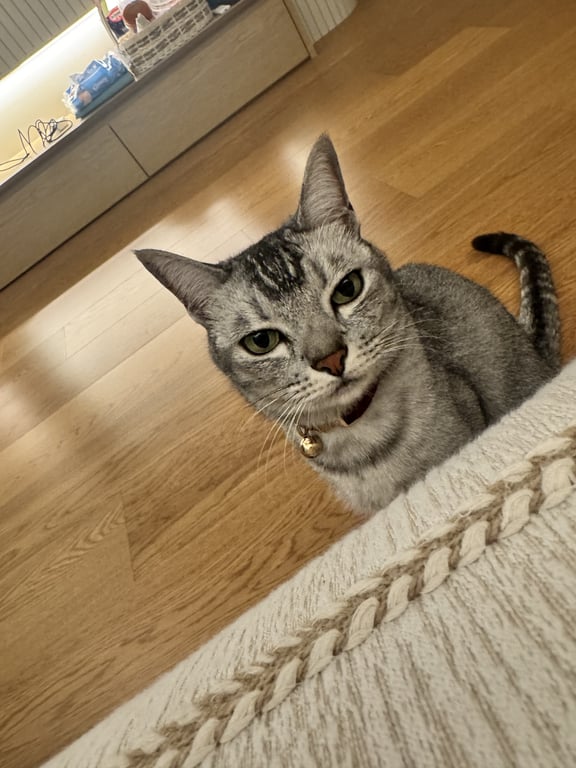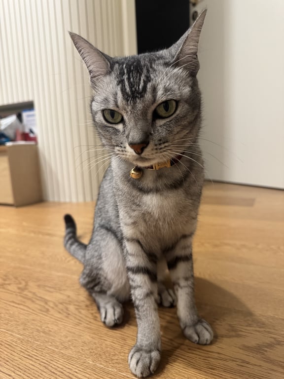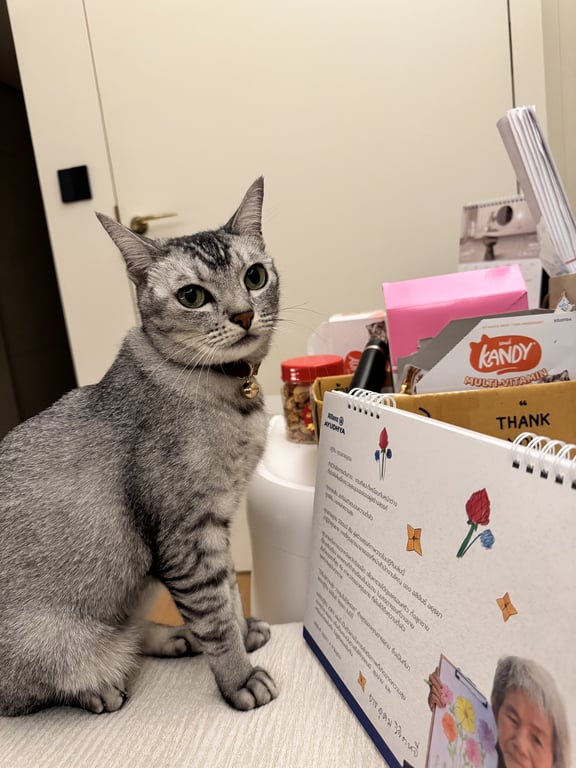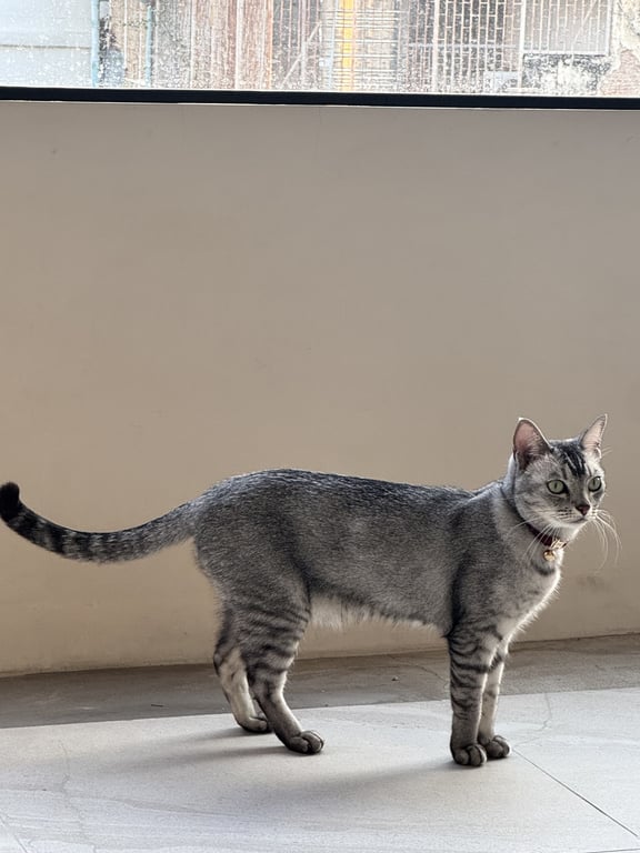 รอยตำหนิ: หลังสีเทาล้วน เส้นกลางหลังเทาดำ ด้านหน้าเป็นลายสลิดนิสัยละมุน น่ารักมาก ขี้กลัว ไม่ดุ ไม่กัด