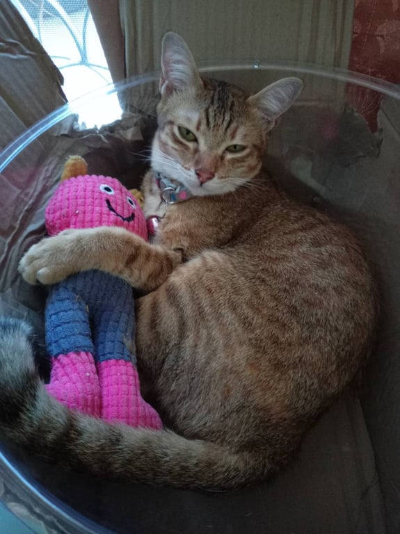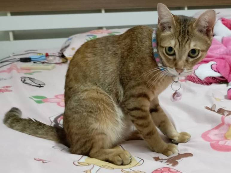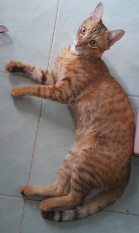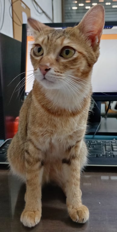 รอยตำหนิ: ฝ่ามือเท้าสีดำ ปากล่างซ้าย มีสีดำ ขนนิ่มลื่น ขนสีส้มทองไม่ชอบให้คนอุ้ม ไม่ชอบคน ติดเจ้าของ ชอบอยู่นิ่งๆตัวเดียว เสียงร้อง แอ๊ะๆ ไม่ร้องเหมียว