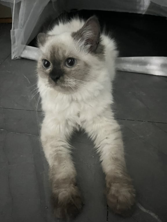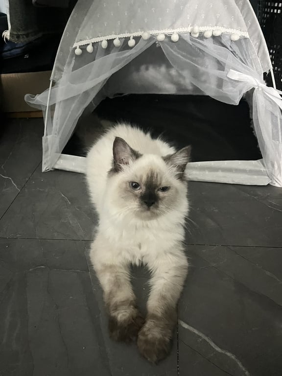 รอยตำหนิ: มีรอยแผลที่หลัง ทายาม่วงให้น้องไว้ที่หลังน้องเป็นแมวเลี้ยงไม่เคยปล่อยออกจากบ้าน ไม่คุ้นคน ตกใจง่าย น้องชื่อกาเซียร์ เพศเมีย อายุประมาณ10เดือน ลักษณะ : แมวขนสีครีม ลายพอยท์ หน้ามาสก์สีเทา/น้ำตาล ตาฟ้า น้องมีแผลที่หลังทายาม่วงไว้