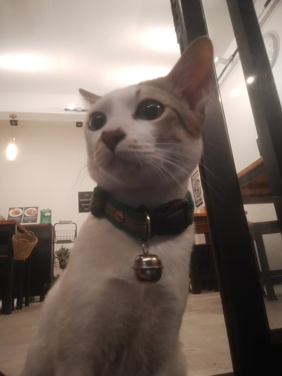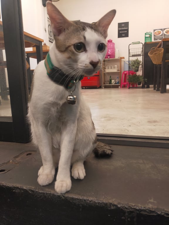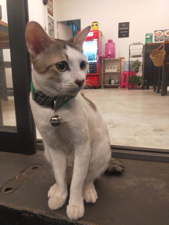 รอยตำหนิ: ขอบตาข้างนึงดำขอบตาข้างนึงสีชมพูใส่ปลอกคอสีเขียว สวมเสื้อขาวแดงลายทาง KFC