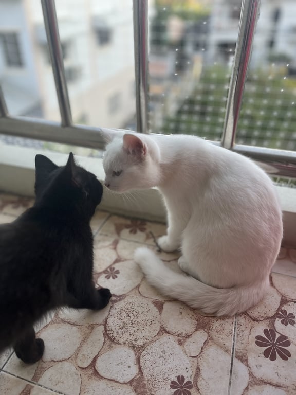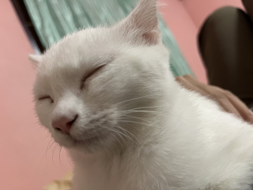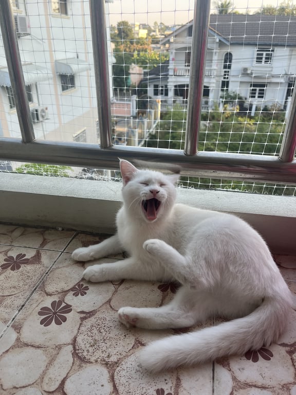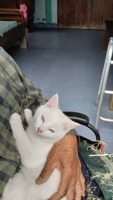 รอยตำหนิ: คอติดสีเหลืองนิดๆ ตัวขาว ปากชมพู จมูกชมพู อุ้งเท้าชมพู4 เดือน